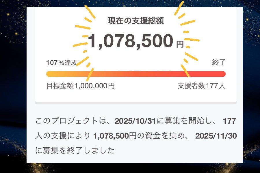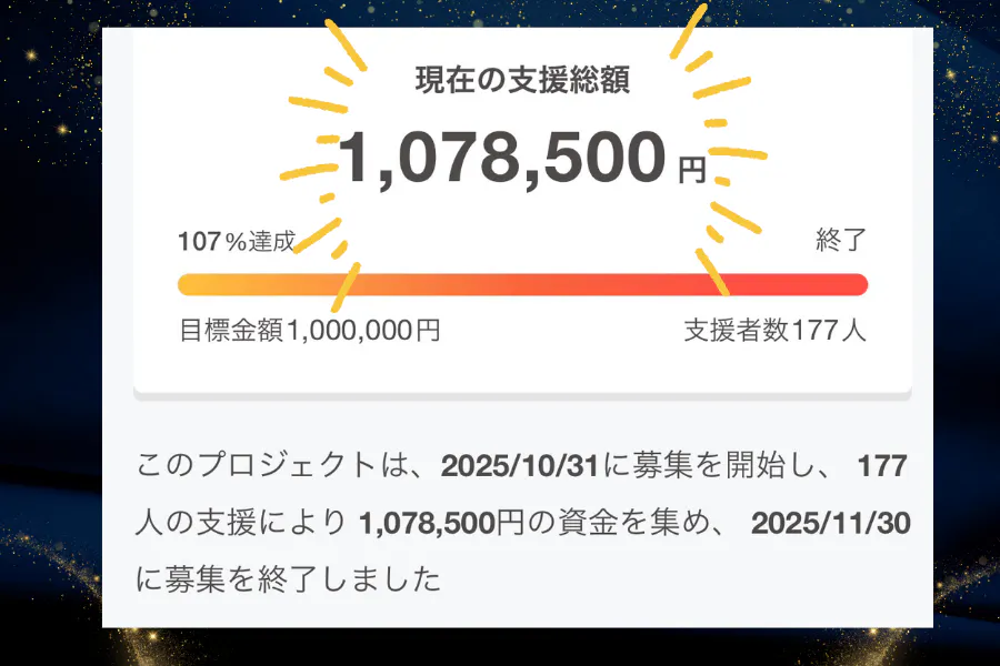 前回の挑戦では、多くのあたたかい応援をいただき、無事に目標金額を達成することができました。本当にありがとうございました!!