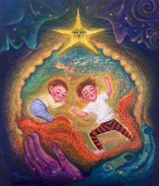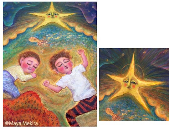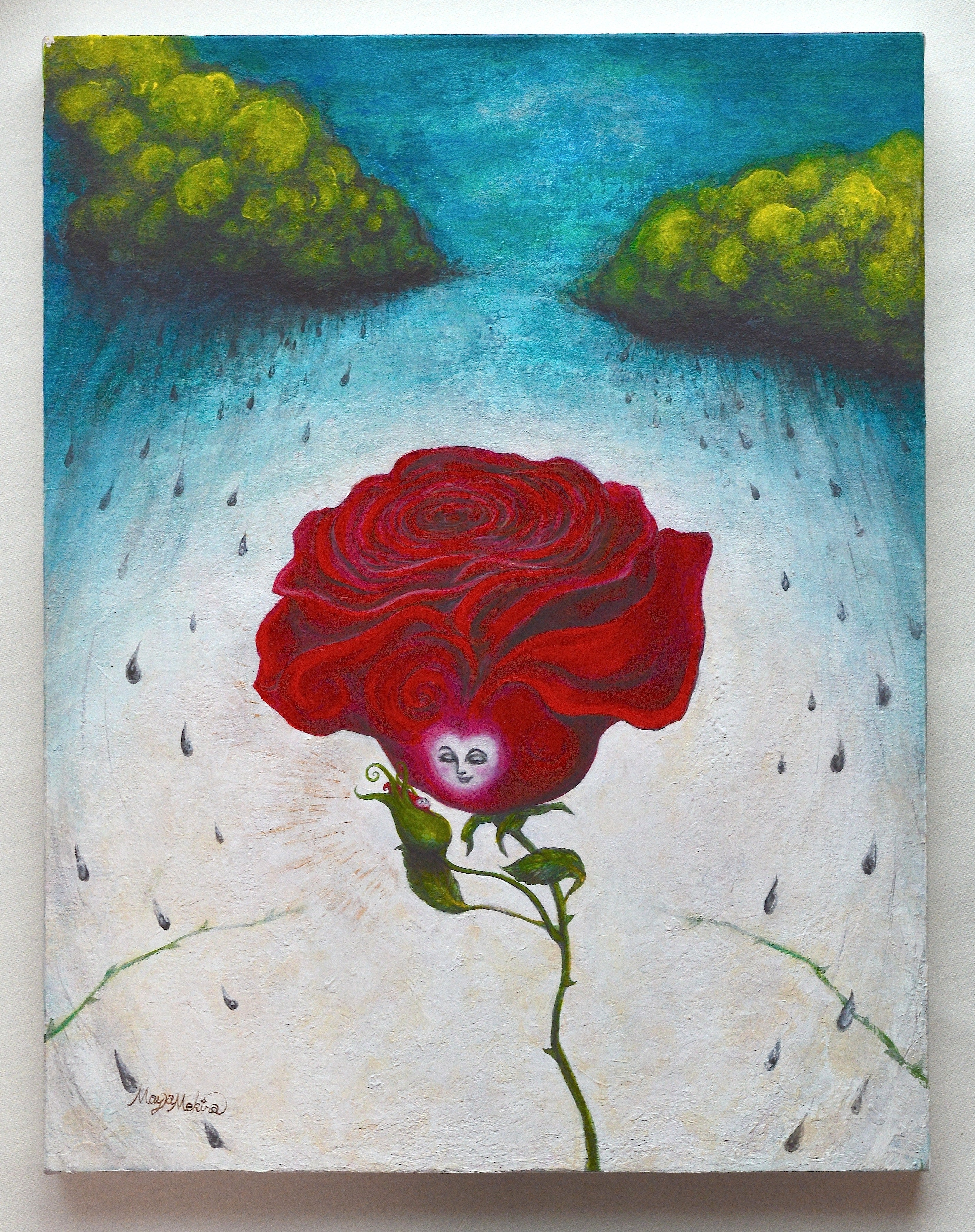 2013年の平面作品で私のお気に入りです。赤ちゃんバラが幸せに眠る表情が可愛いです。Maya Mekiraのアートポストカード1枚とメッセージカード付きです。