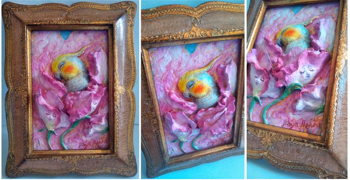 A sweet pea and cockateel(スイートピーとオカメインコ)2018'/Mayaのハガキサイズの立体絵画。