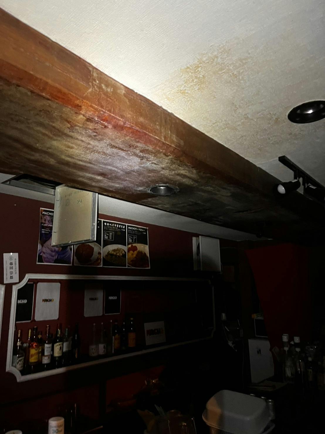 マチョカフェ、天井からの大量水漏れで営業停止中。