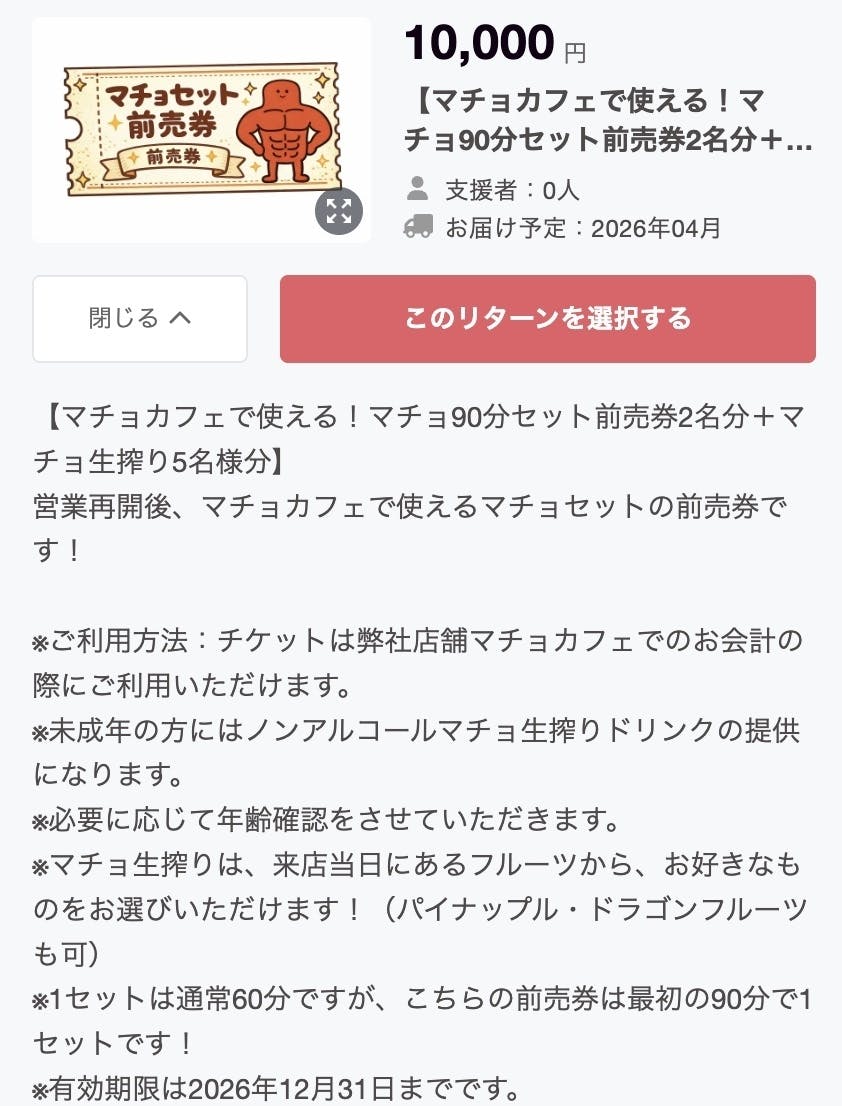 2026/01/02 16:46こちらのリターンですが、リターンの内容に、【マチョカフェで使える!マチョ90分セット前売券2名分+マチョ生搾り5名様分】と誤った記載がされておりますが、正確には、【マチョカフェで使える!マチョ90分セット前売券2名分+マチョ生搾り2名様分】です。前売り券と同じ数のマチョ生搾りがリターン内容ですので、ご確認よろしくお願いします。 もっと見る