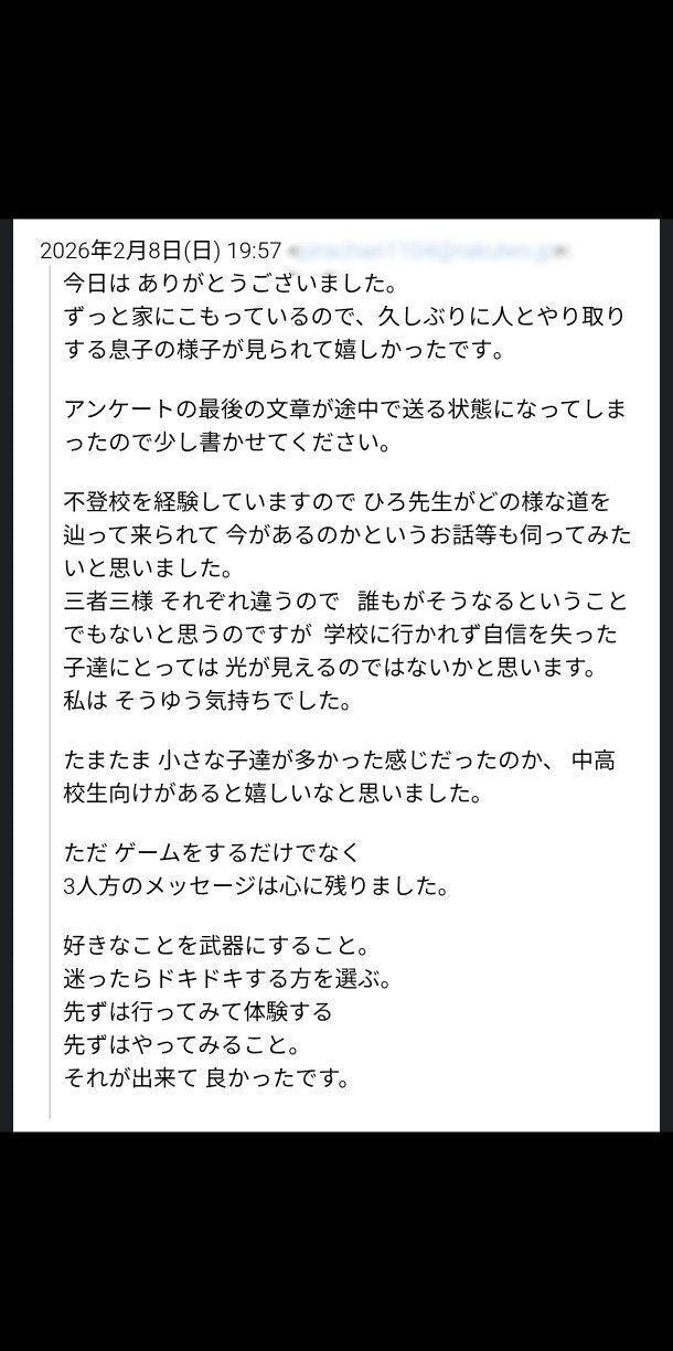 2日間の「メタバースクエスト」が先日無事に終わりました。活動報告は改めてさせていただきますが、今日はこの1通のメールをご紹介させてください。(掲載許可はいただいております)皆さんのご支援が、参加されたご家族の人生のターニングポイントになったのかもしれません。本当にありがとうございます。そして一か月に渡るクラウドファンディングも先日終了いたしました。これから何度かイベントを開催して、お子さんたちのお声を丁寧に拾っていきたいと思っています。そのための活動資金として、ありがたく使わせていただきます。ここ1か月、かなり体に無理をさせてしまったので、少しだけ休息をいただき、また活動について発信していこうと思っています。引き続きこの活動のチームメンバーとして関わっていただけたら幸いです。よろしくお願いいたします。2026年2月9日笹井 裕之