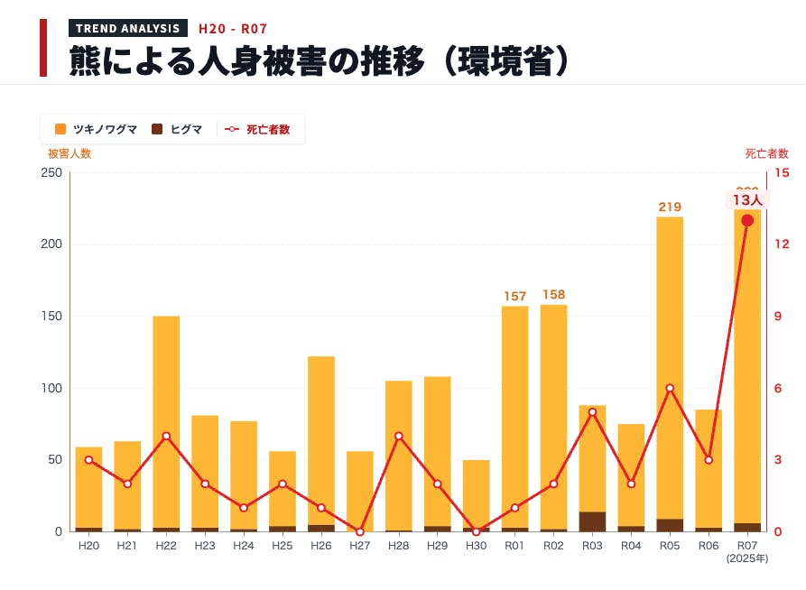 2025年11月末時点で被害者は220人を超え、死者は13人(「環境省 クマ類による人身被害」より)
