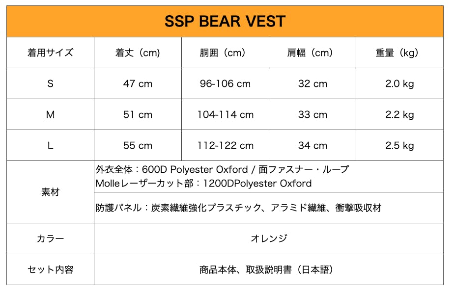 ③ SSP BEAR VEST:製品サイズ、重量、素材
