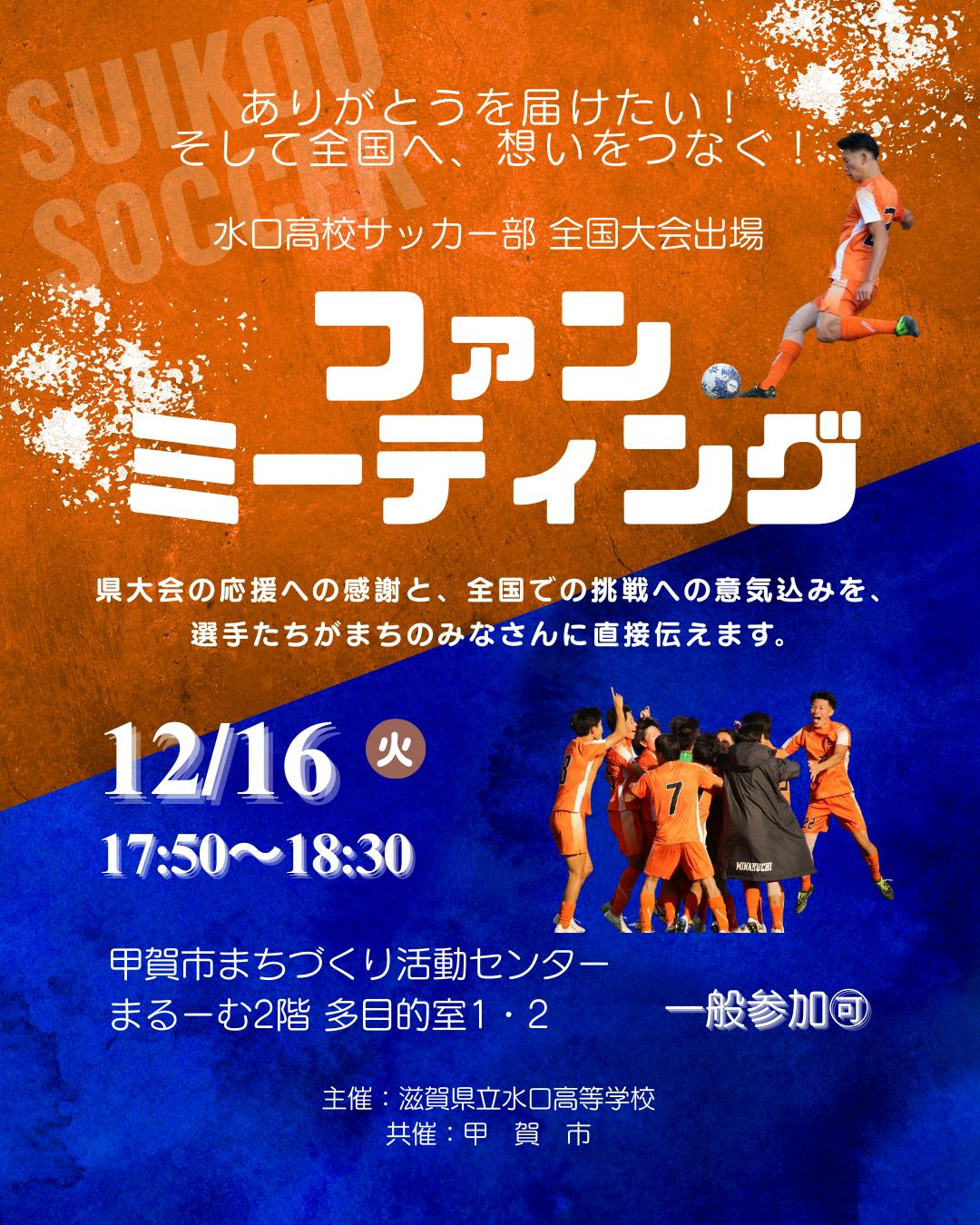 【水口高校サッカー部 ファンミーティング開催決定!】\市民の皆さまへ、直接お伝えしたいことがあります/このたび、水口高校サッカー部が29年ぶりに全国大会出場を決めました!このファンミーティングでは、県大会での熱い応援への「感謝」全国大会に向けた「意気込み」を、選手たち自身の言葉で、市民の皆さまにお伝えします!応援してくださった方もこれから応援したいと思ってくださる方も地域の子どもたちも、OB・保護者の方もどなたでも大歓迎です。市内外を問いません。まち全体で、この快挙を一緒に喜び、全国へ送り出しましょう!まちは今、応援のエネルギーに包まれています。みんなで「オレンジの輪」をもっともっと広げましょう!【水口高校サッカー部 ファンミーティング】開催日時:12月16日(火)17時50分〜18時30分開催場所:甲賀市まちづくり活動センター まるーむ 2階 多目的室1・2(甲賀市水口町水口6009−1)主催:滋賀県立水口高等学校共催:甲賀市