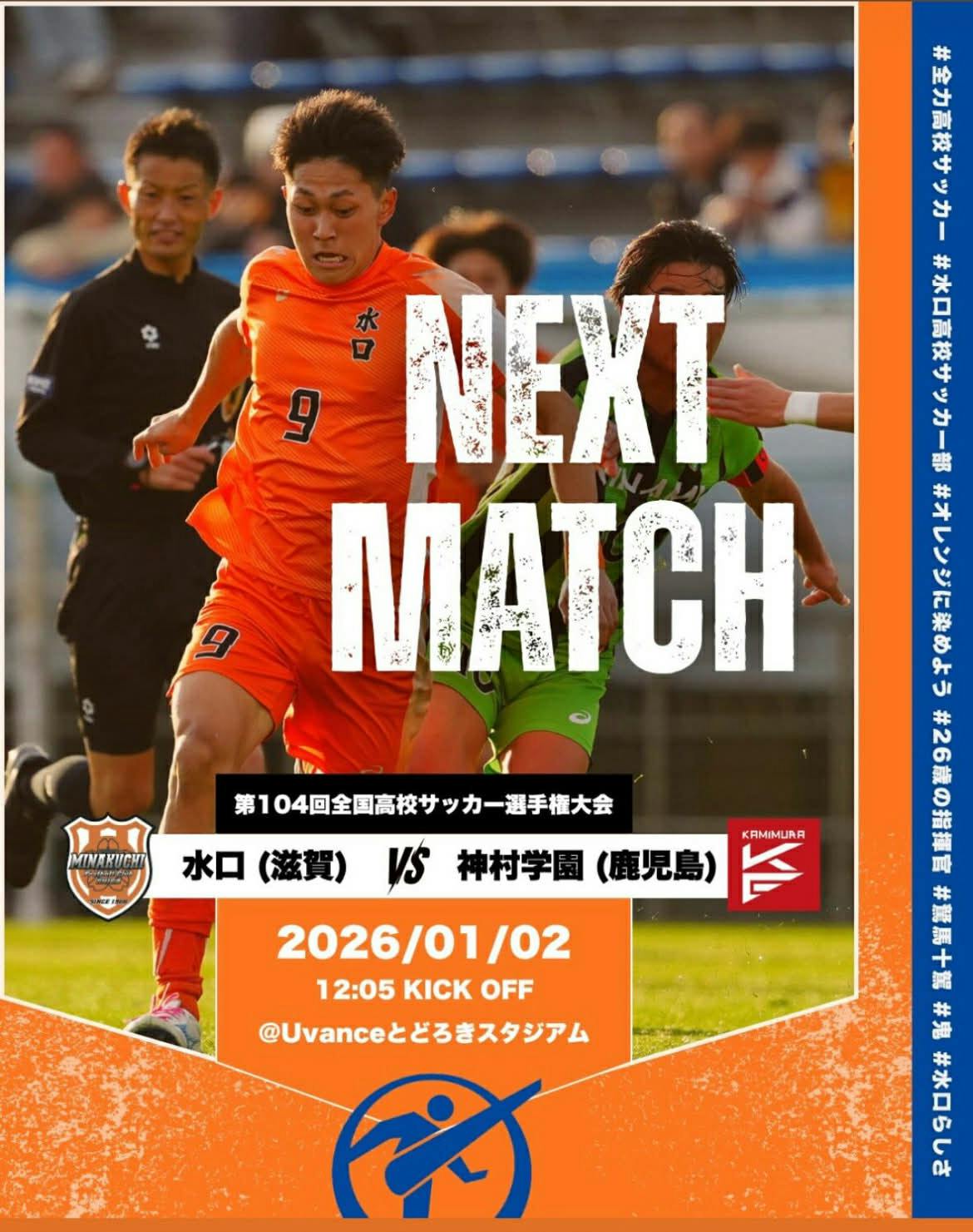 2025/12/31 17:31快進撃続く!水高サッカー部、全国ベスト16進出!水口(滋賀) 3 – 1 広島皆実(広島) 得点者・前半7分:DF 山本 蓮(2年)・前半12分:MF 岡 浩平(3年)・後半14分:FW 重田 遙輝(3年)全国優勝経験もある強豪・広島皆実を相手に、堂々たる勝利!29大会ぶり出場とは思えぬ堂々たる試合運びで、オレンジ旋風が止まりません!「水口らしさを出して思い切って戦いたい」夘田監督の言葉通り、“水口らしさ”が全国の舞台で光を放ちました。1点2点と点差があっても、最後までひたむきに頑張る選手たちの姿に感動です。次戦は、全国屈指の強豪・神村学園!2026年1月2日(火)12時5分VS 神村学園(鹿児島)@等々力陸上競技場!この勢いとともに、全国からの応援と支援の輪も広がっています。しかし、勝ち進むごとに必要になる移動費・宿泊費・活動費の負担は、想像以上に大きくなっていきます。「がんばれ!」の気持ちを、ぜひクラファン支援というカタチで届けていただけませんか。どんなエールも、選手たちの力になります。水高の挑戦はまだまだ続く。共に声援を届けましょう! もっと見る