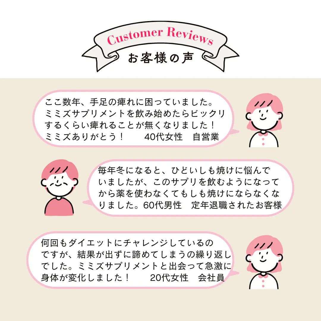 配合成分:ミミズ乾燥粉末、発酵大豆イソフラボン、還元型コエンザイムQ10、 レスベラトール、ビタミンB1、 ビタミンB2、 ビタミンB6、ビタミンB12、葉酸、 ビタミンD、 ビタミンE ほか