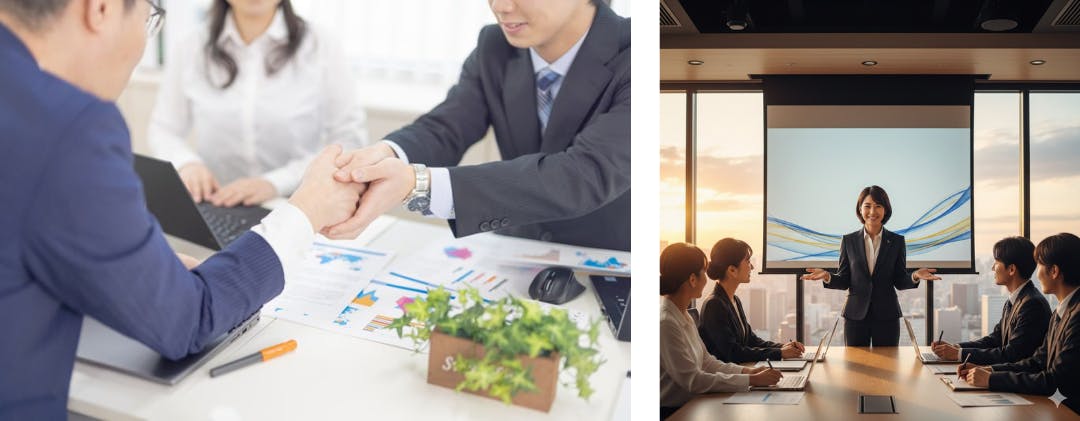 重要な会議でのプレゼンテーション成功。聞き手を納得させ行動を促す。
