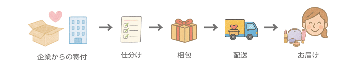 行き先を失ったコスメをお預かりし、支援団体や自治体を通じて「コスメ詰め合わせギフト」として
