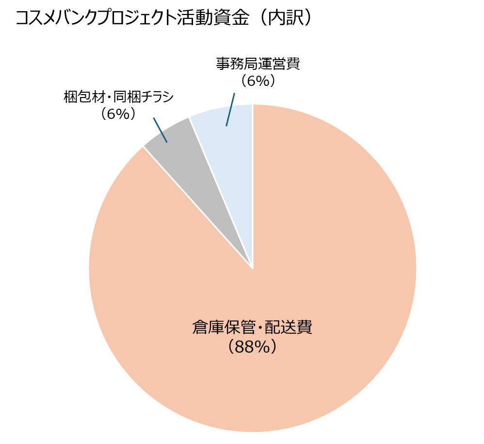 コスメバンクプロジェクトは、賛同企業・団体等からの年間寄付金約2,500万円を元に活動していますが、年間経費の9割以上は商品の倉庫保管料および資材、梱包、配送コストが占めています。今後もコスメバンクプロジェクトの活動を安定的に継続できるよう、ぜひご寄付という形で多くの方にこの活動にご参加いただけましたら嬉しく思います。