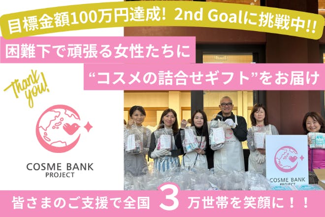 2026/03/16 22:49このたびはコスメバンクプロジェクトへのご支援を誠にありがとうございました。お陰さまで第一目標としていたゴールを超える多くのご支援をお預かりすることができました。本プロジェクトの活動に多くの方が関心や共感を寄せてくださり、多大なお力添えを賜りましたことに、改めて心より感謝申し上げます。世界各地に広がりつつある紛争、日々の暮らしに直結する物価高、AIなどにより急速に進む社会の構造変化等…、将来への不安は増大する一方であると感じており、中でも、ひとり親世帯のお母さんやお子さんは、よりいっそうの困難や不安を抱えておられることと思います。私たちにできることは決して多くはありませんが、困難な状況下で頑張っていらっしゃる皆さまのお手元に、心を込めて準備したコスメギフトをお届けすることで、少しでもご家庭に団らんや安らぎが生まれたら…そして、ひとつでも多くの「自信」や「笑顔」につながれば…と、心から願う次第です。ご寄付とともにお預かりした多数の温かいメッセージもしかと受けとめ、「あなたを応援している人がたくさんいる」という事実とともにギフトをお届けできるよう、化粧品メーカーをはじめとしたパートナー企業の皆さま、女性支援団体の皆さまとともに、おひとりおひとりに心を込めてお届けしてまいります。プロジェクト関係者一同、これからも「女性と地球にスマイルを……」を合言葉に、ひとつでも多くの笑顔や自信が生まれることを願いながら精一杯活動してまいります。今後ともお力添え賜りますよう、よろしくお願い申し上げます。バンクフォースマイルズ代表理事山田メユミ もっと見る