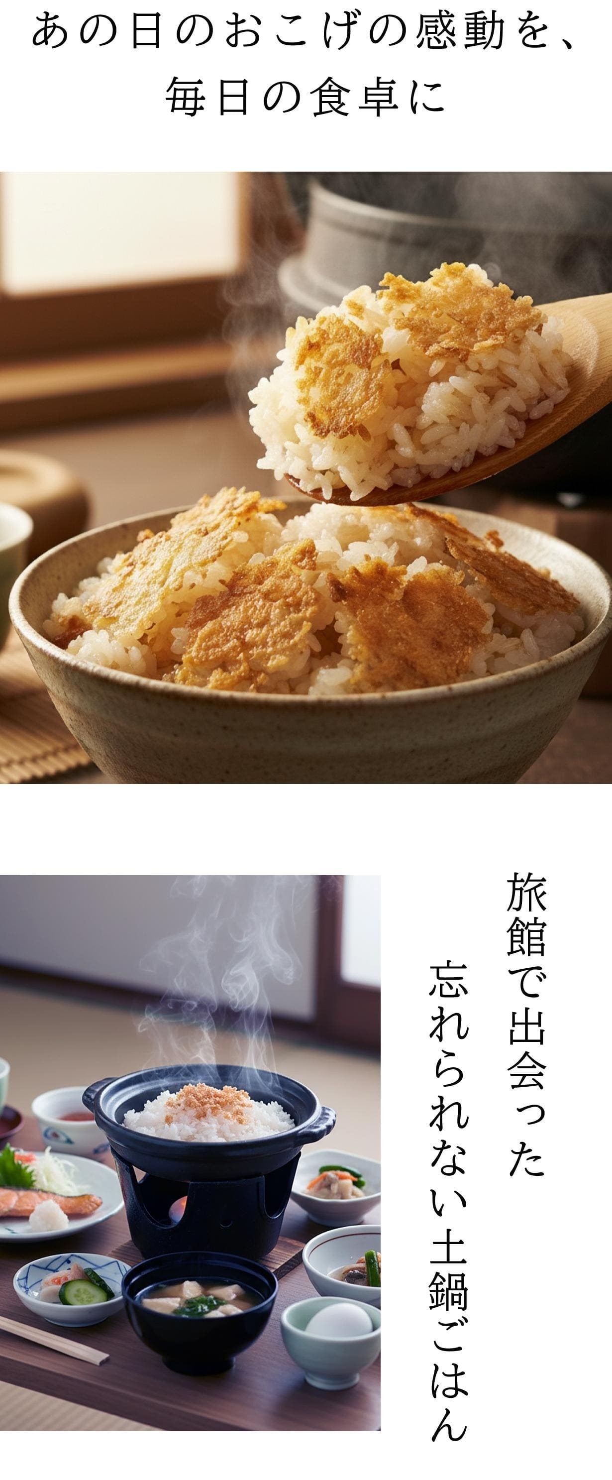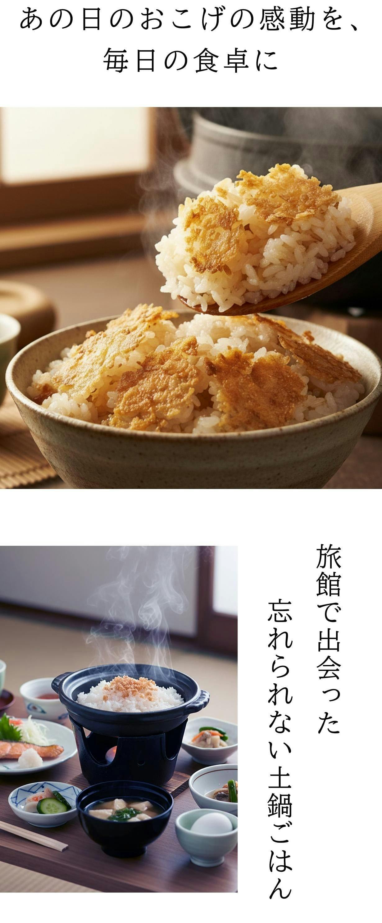 パリッとした食感と香ばしい風味。 おこげは土鍋炊飯の醍醐味です。