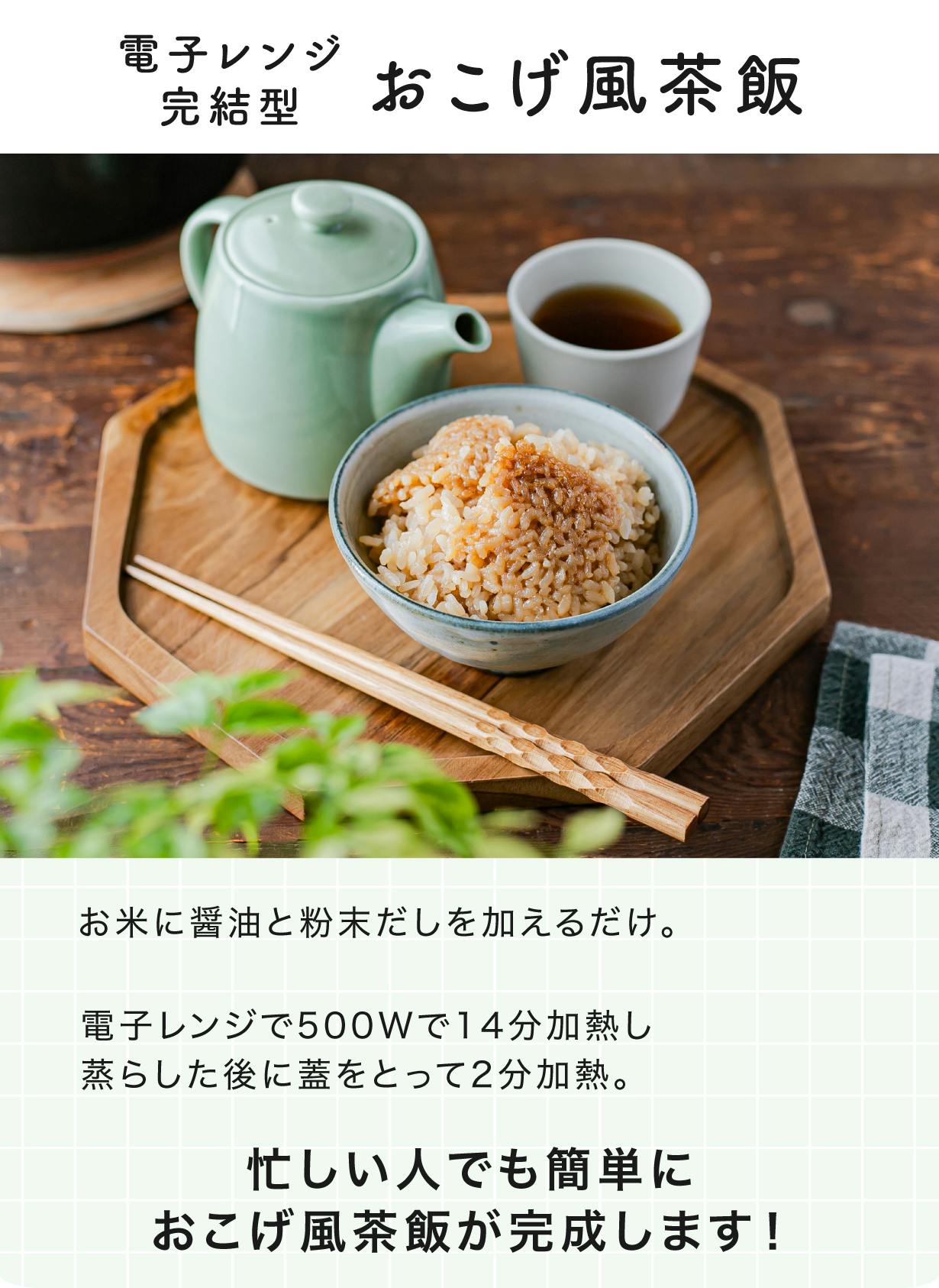 電子レンジだけで本格的なおこげが楽しめる、 新しい体験をぜひお試しください。