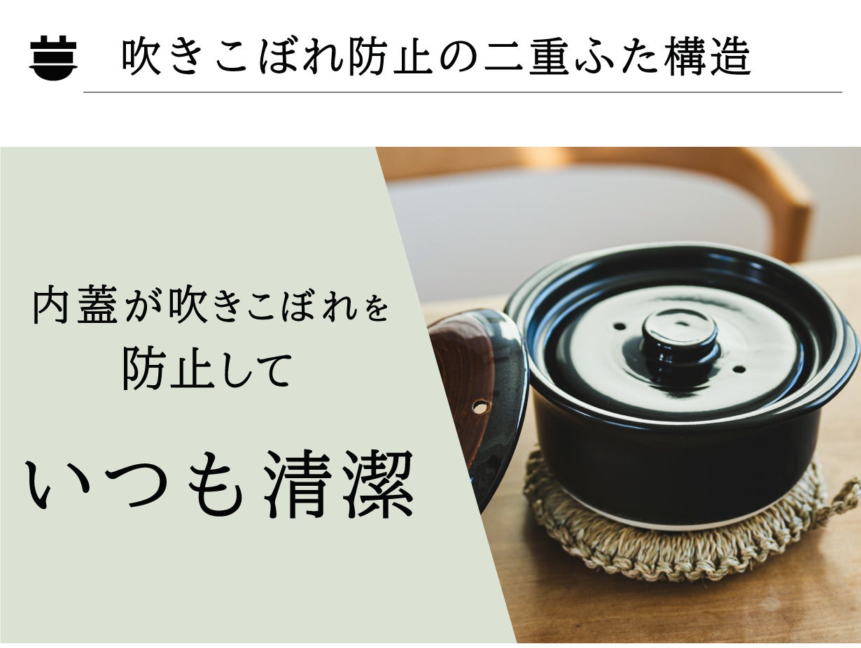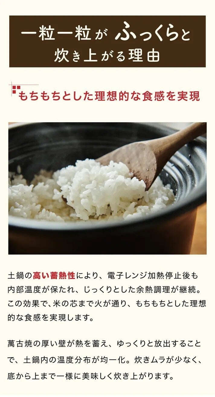 伝統の萬古焼技術により、 電子レンジでも本格的な土鍋炊飯を実現。
