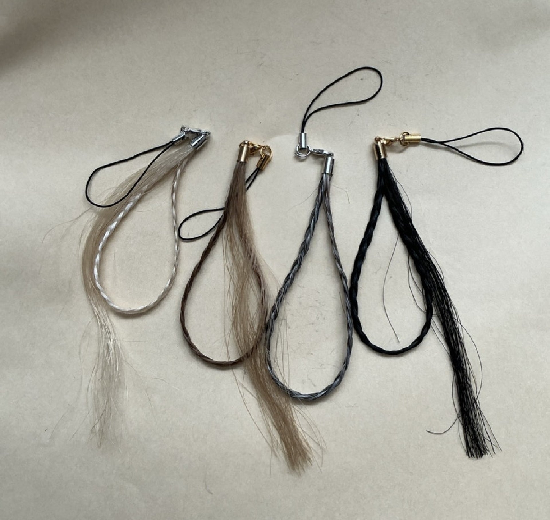 牧場の馬たちに尻尾の毛を分けてもらい、オーナーが手仕事で作ったストラップです。