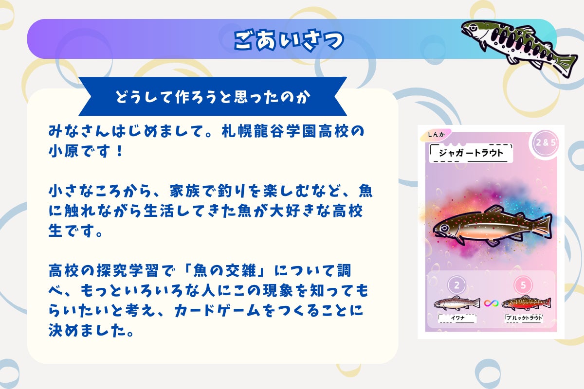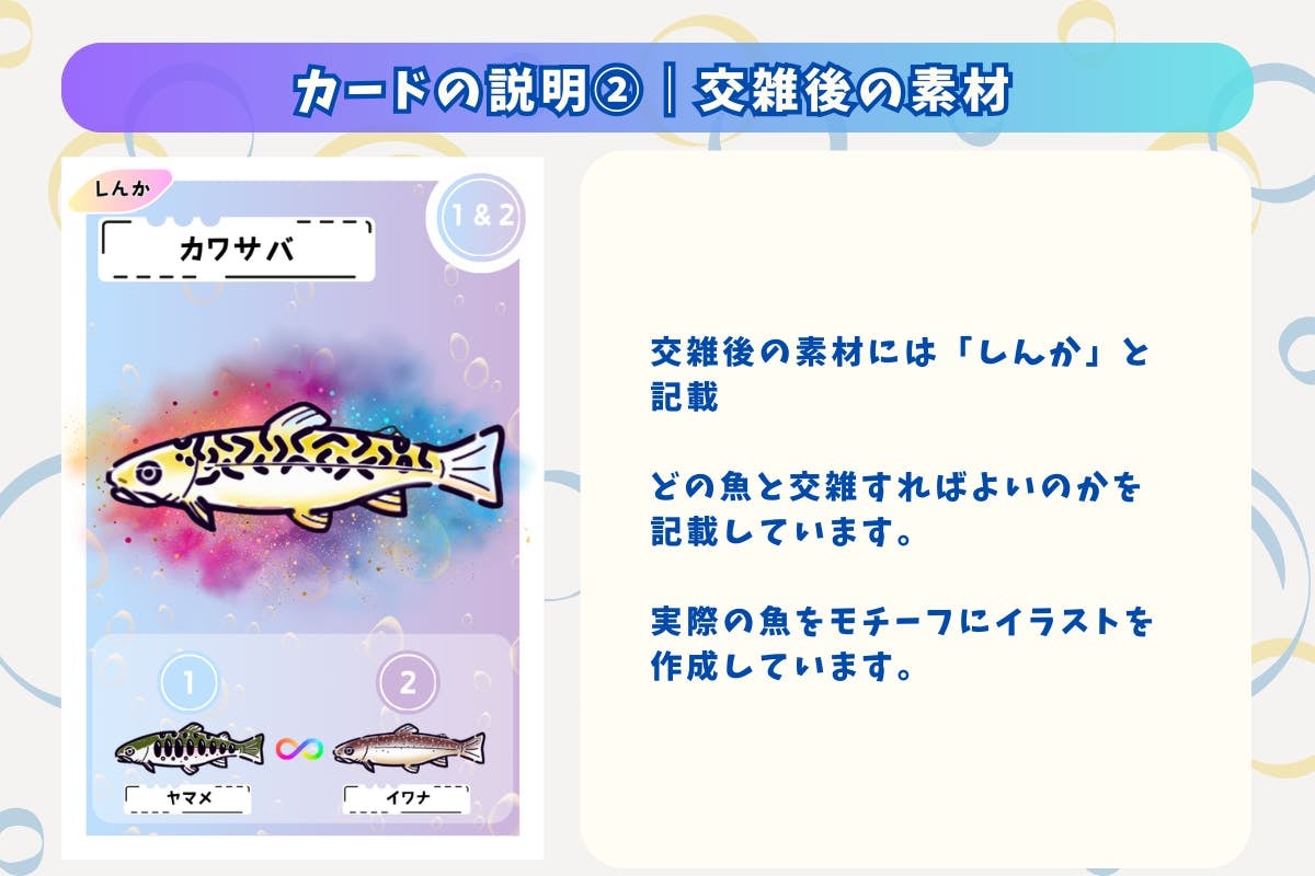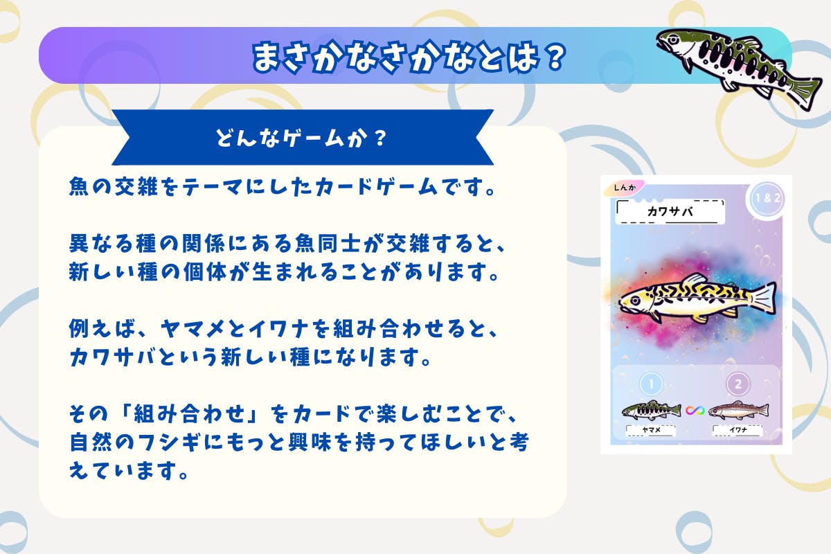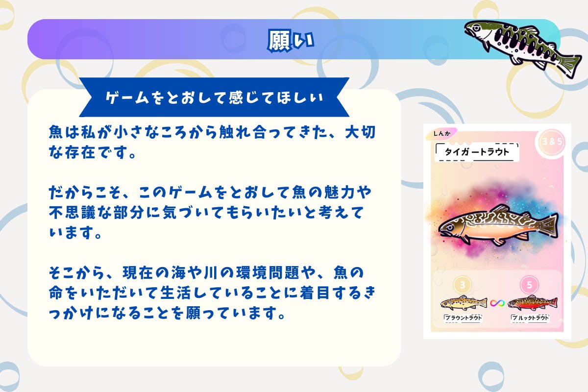 カードゲームをして楽しんでもらうのはもちろん、魚の魅力と、魚を取り巻く問題について考えるきっかけになると嬉しいです!