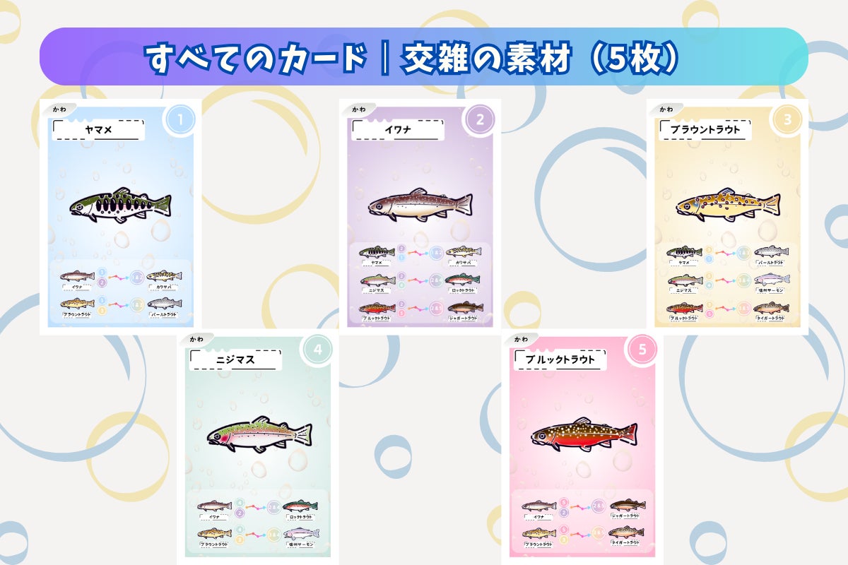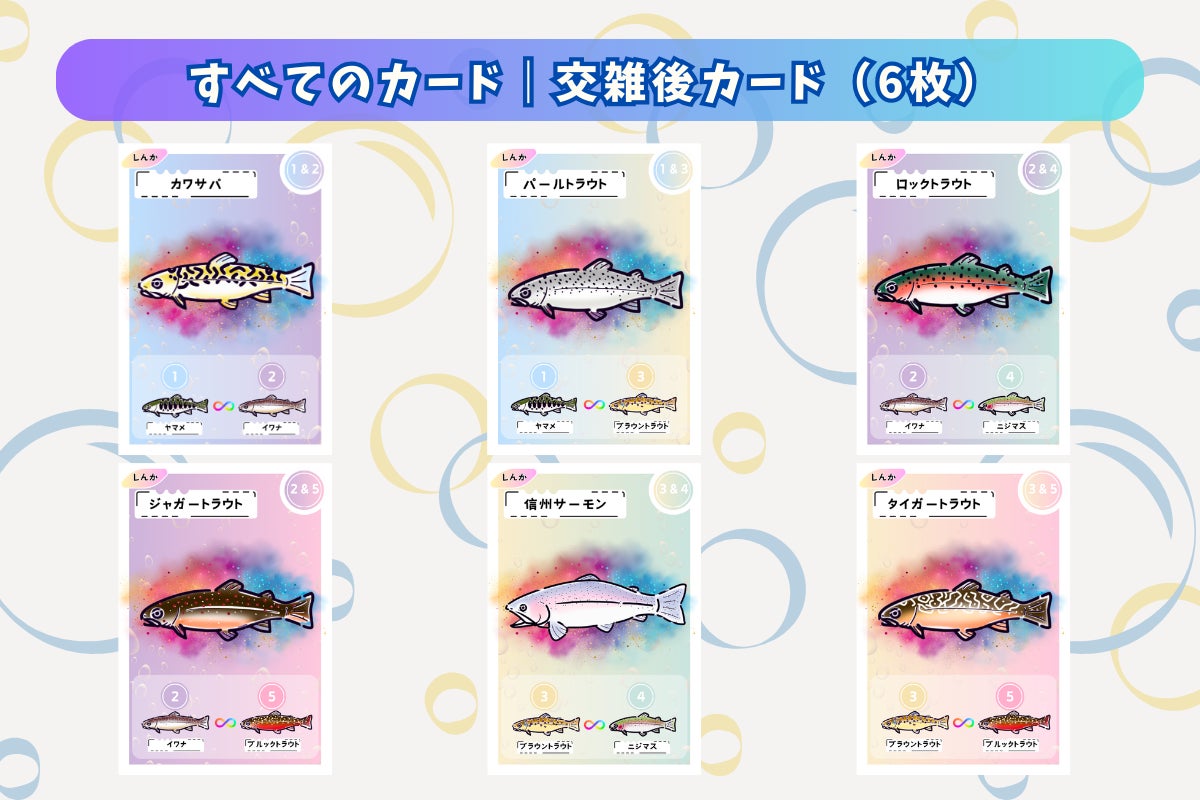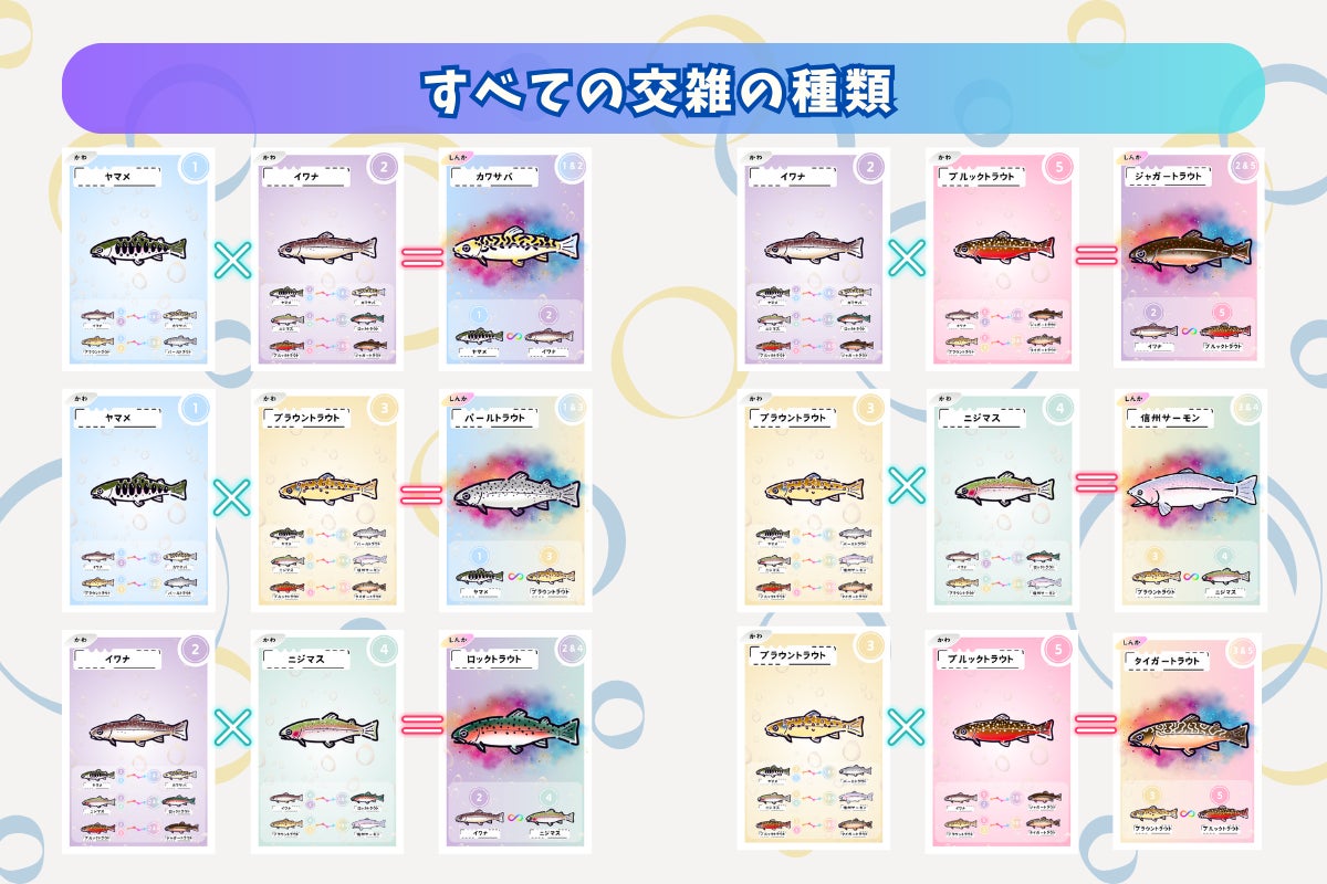 交雑前の魚は各6枚×5種類=30枚、交雑後の魚は各4枚×6種類で24枚、合計54枚で構成されています。
