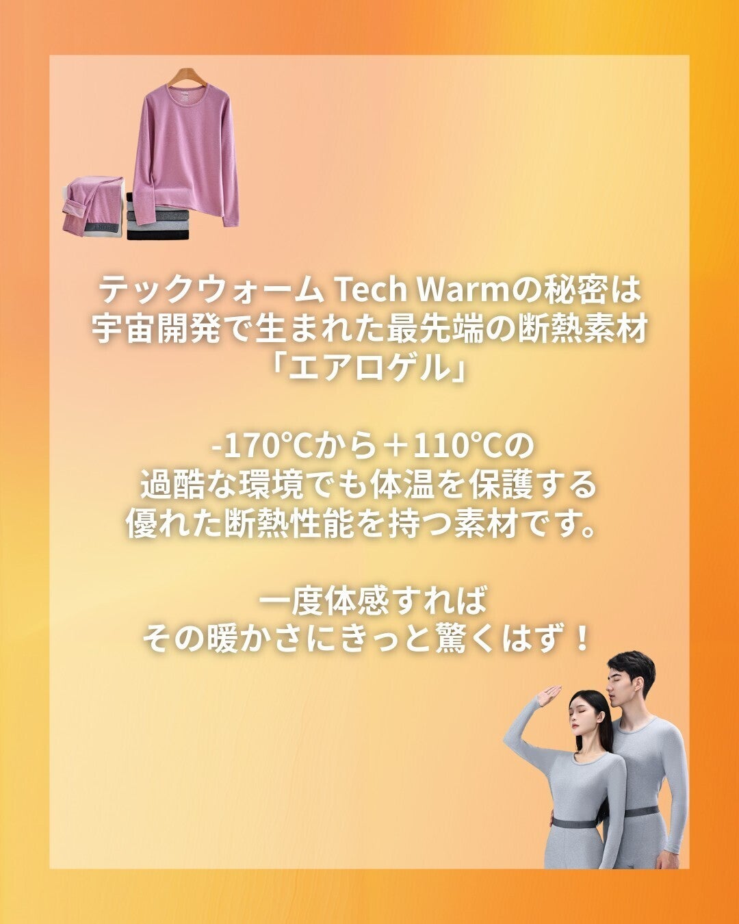 テックウォームは薄手のまま暖かさを目指し、上下セットでお腹・腰・脚までしっかりカバーします。