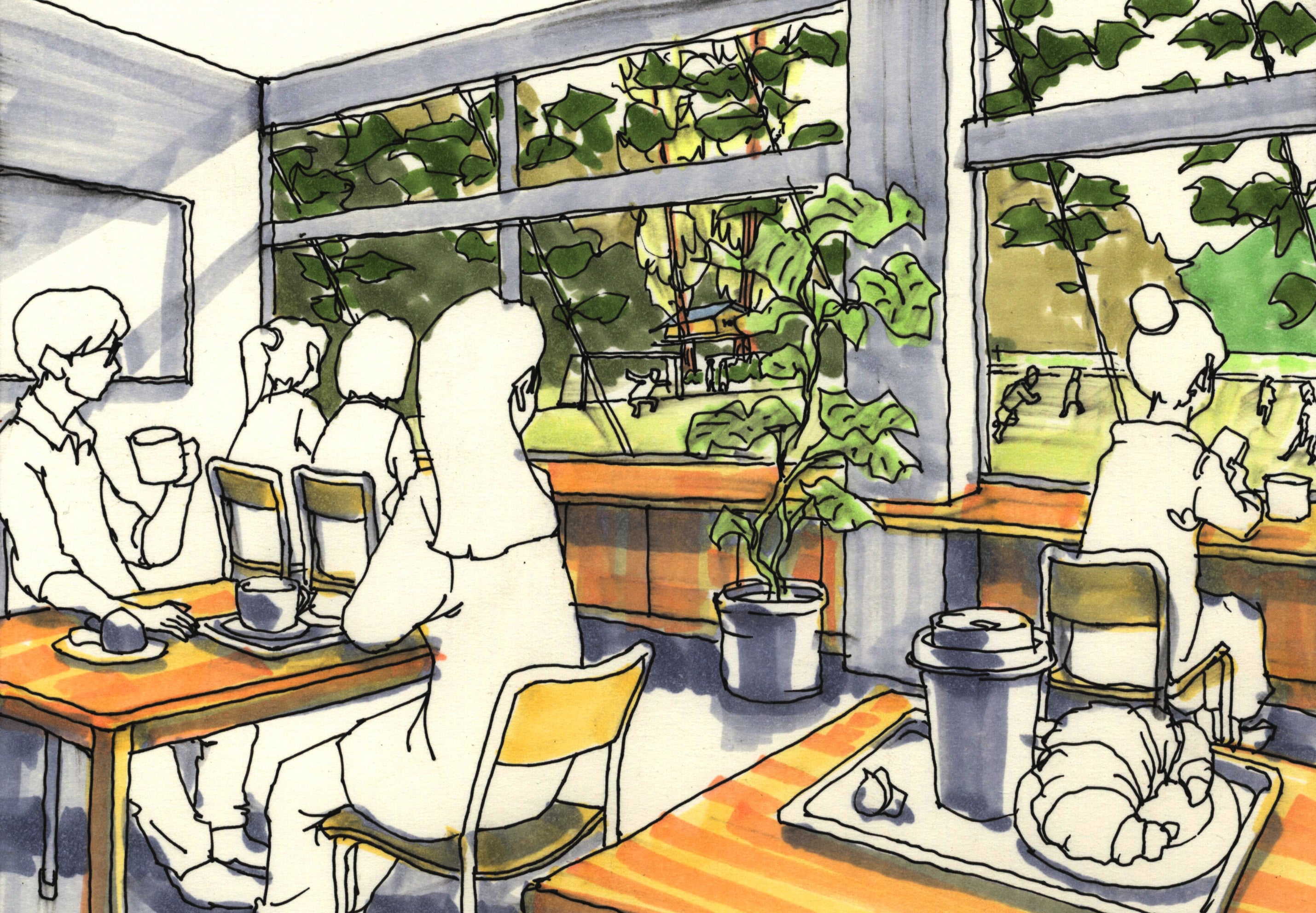 カフェ:山間の景色を背景に、子どもたちがグラウンドを走り回る姿を眺めながらオリジナルのスイーツメニューをゆっくり楽しめる時間