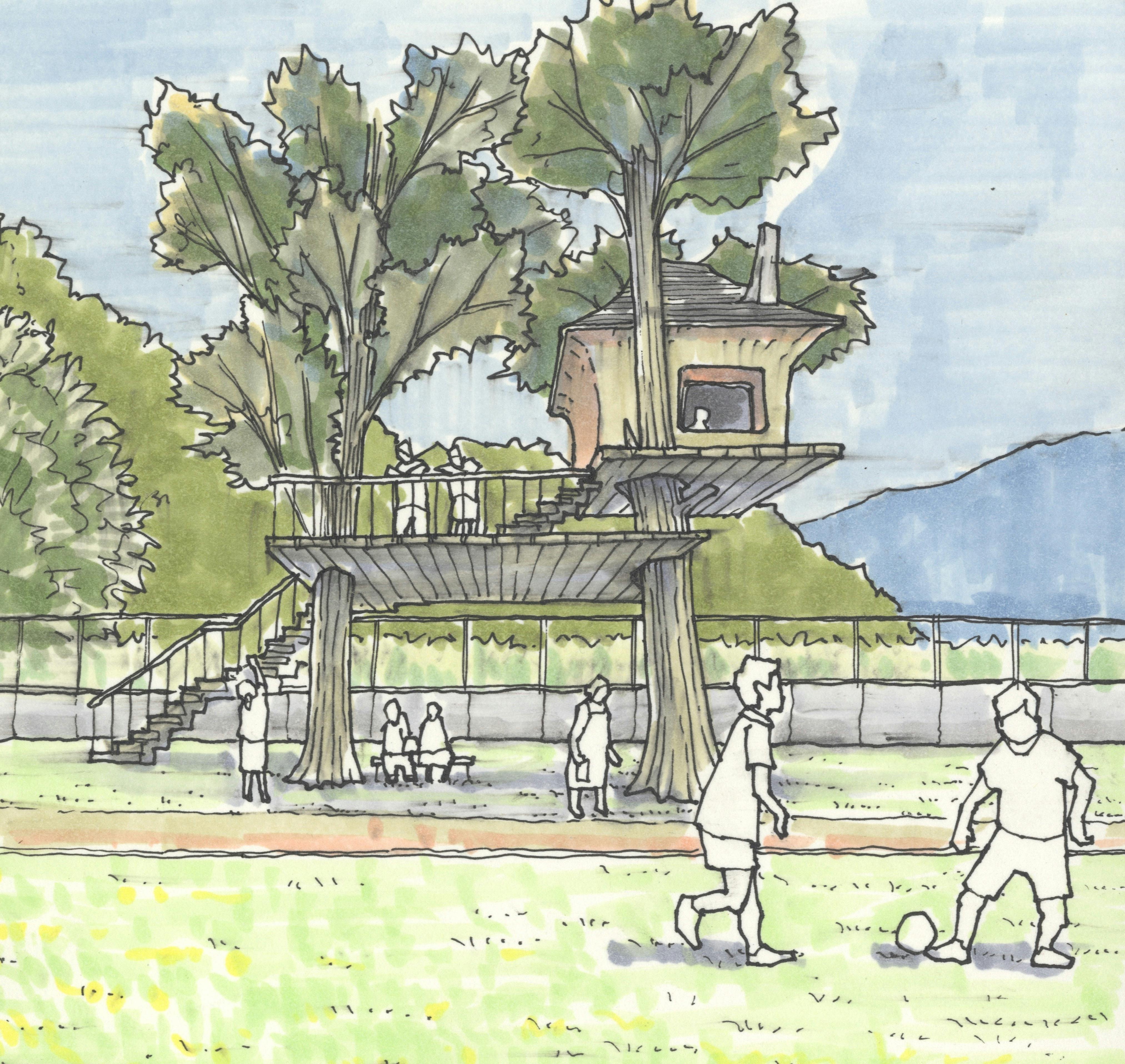 このプロジェクトではそのシンボルとして、グラウンドに残された大きなメタセコイヤの木に樹上茶室「ツリーティーハウス」を建てる建設費を集めます。