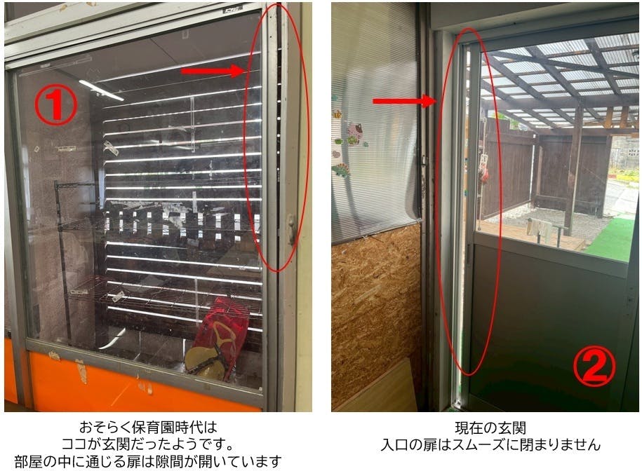 もともとの玄関部分は道路に面しているため木材でつぶし(写真①)、園庭に面した出入口が現在の玄関になっています(写真②)。