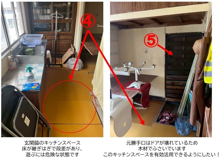 玄関入ってすぐ左手にあるキッチンスペースは、床が継ぎはぎで段差があり明るさも十分ではないので、子どもたちも立ち入らないのが現状です(写真④⑤)。
