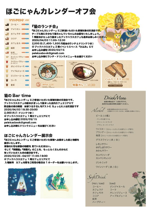 『ほごにゃんカレンダー』にご参加、ご購入された皆様にはクローズの会として当日『猫のランチ会』『猫のBar』を開催いたします。