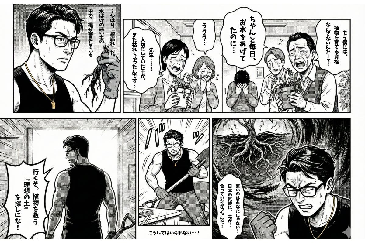 ■ 「植物のお医者さん」としての決断「なぜ枯れたのか理由がわからない」という多くの声に応えるため、私は独立し、植物の訪問診療を行う「植物のお医者さん」になりました。数多くの診療を行う中で確信したのは、「誰でも簡単に植物を育てられる環境を作るには、まずは『土』を変えなければならない」ということでした。