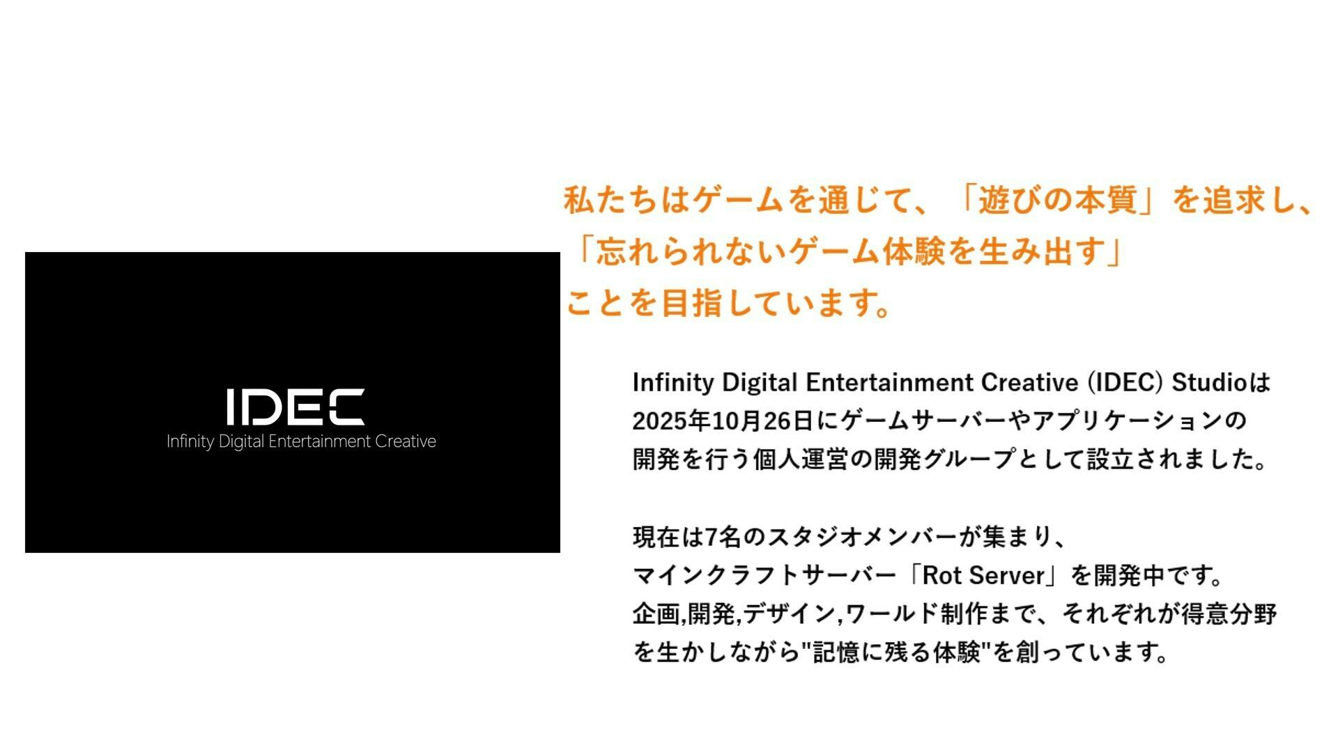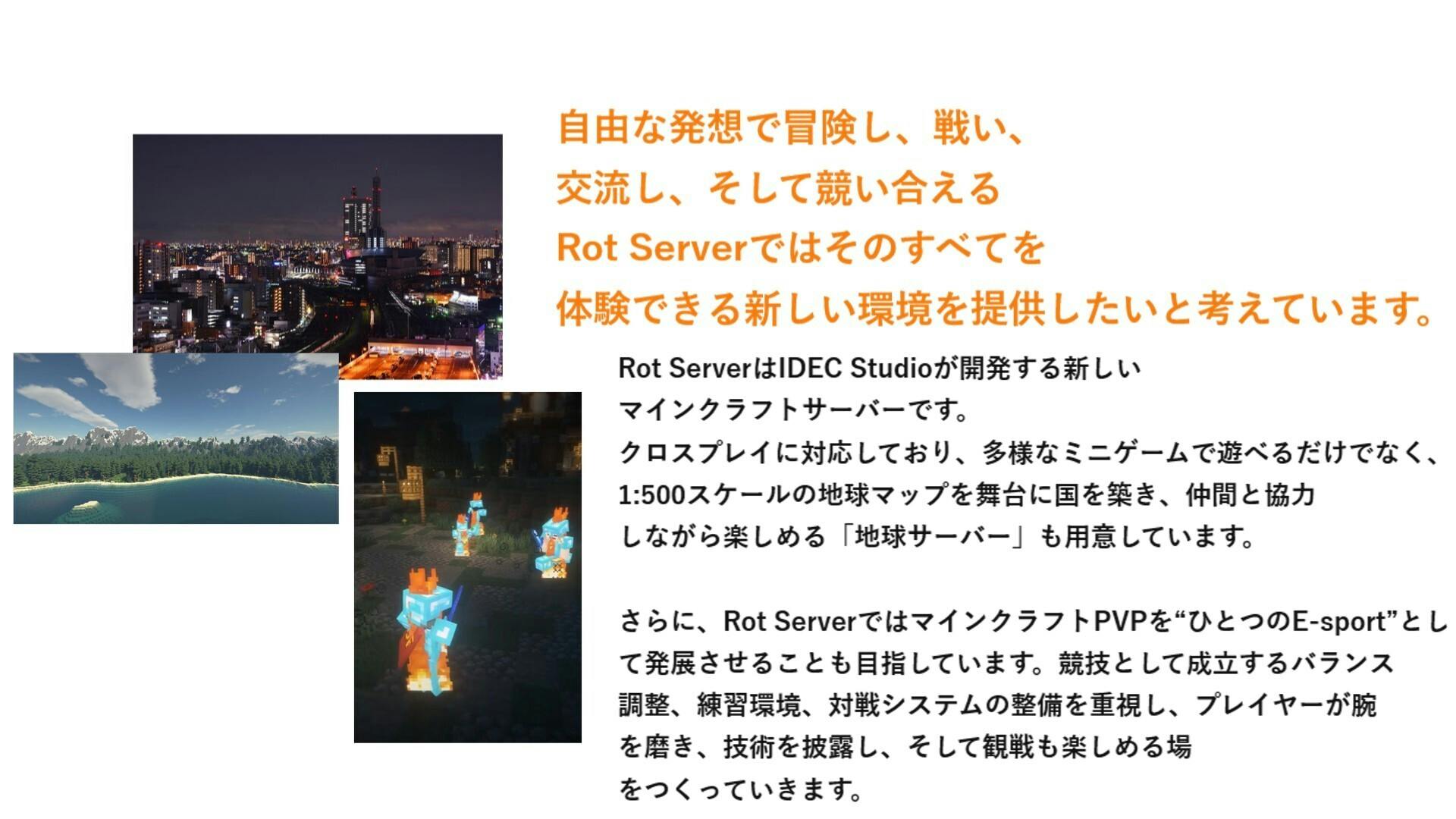 ※「Rot Server」はIDEC Studioが独自に運営するマイクラサーバーであり、Microsoft及びMojangとは一切関係ございません。また、両社による承認・提携・後援等を受けたものではありません。