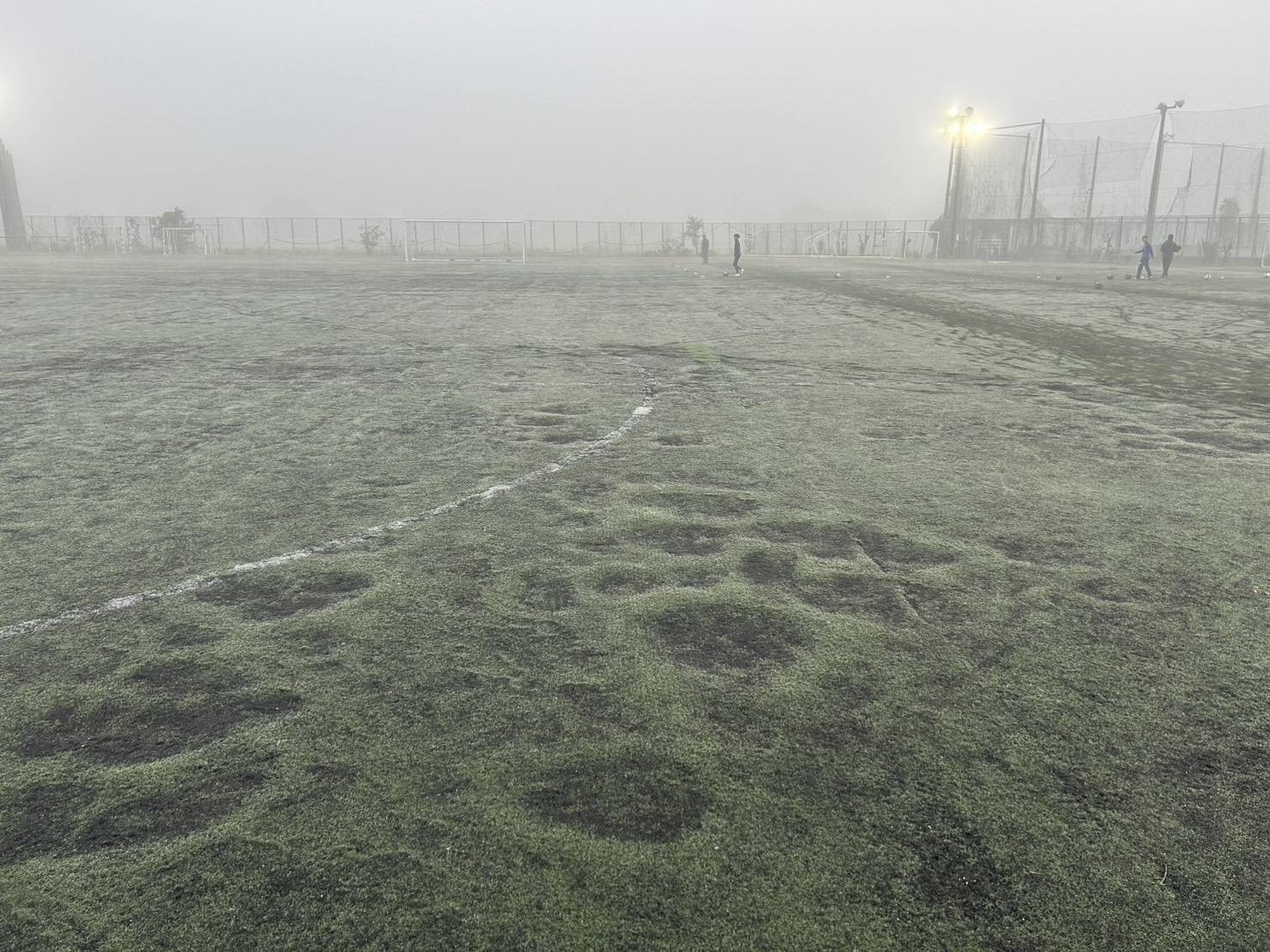 人工芝ピッチの完成から約18年が経過しました。7~8年程前から人工芝パイルの摩耗や劣化が激しく、初めてピッチに足を踏み入れた方は「あれっ?絨毯?」と感じるぐらいにツルツルの状態となっています。滋賀県からご支援いただいている修繕費、「学校応援寄付」等で特に傷みの激しい箇所をその都度修繕していますが、全面改修には至っていません。このような状況下で、「芝に足を取られて転倒した。」また、摩耗の激しい部分と修繕した部分とでは高低差が生じていますので、「足が引っかかって、膝の靭帯を損傷した。」などケガの報告が増えています。