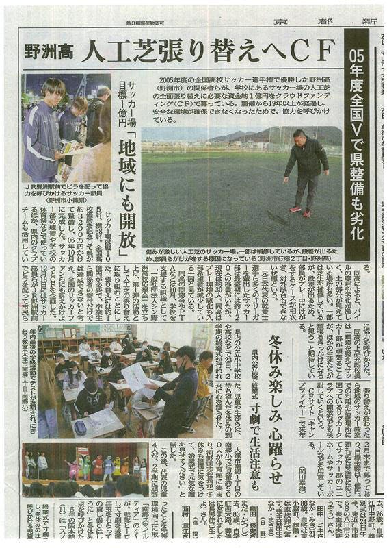• プロジェクトを公開して5日目。毎日たくさんのご支援と応援、反響をいただきありがとうございます。先日、読売新聞様に記事として取り上げていただきましたがその翌日からは地元の方をはじめ、たくさんの方々から応援を頂くようになりました。本当にありがとうございます。そして、本日は「デイリースポーツ」様にも記事を取り上げていただきました。“セクシーフットボール”を再び 野洲高が劣化した人工芝グラウンドの改修へクラウドファンディング開始 目標1億円https://news.yahoo.co.jp/articles/09f8c384253f35acb5f0c9bc771005622f8576dc今、滋賀県ではサッカーに関するニュースが数多く取り上げられています。(そう感じてしまうのは私がサッカーびいき目線だからでしょうか?)この滋賀県サッカーブームの勢いに乗って、我ら野洲高校サッカー部クラファンプロジェクトもこの年末年始を盛り上げて行きたいと思っています!ぜひお知り合いの方にも拡散して頂き、ご一緒に盛り上がってください〜 もっと見る