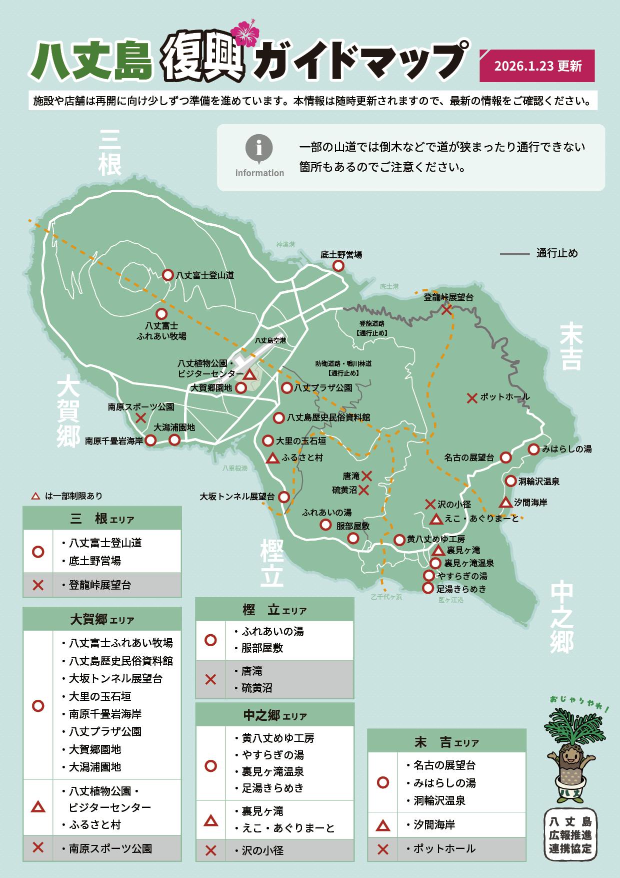 八丈島復興マップ(2026.1.23更新)を見ていただくと、バツ印の大部分は三原山エリアにあります。山の復旧作業は後回しになっているのが現状です。