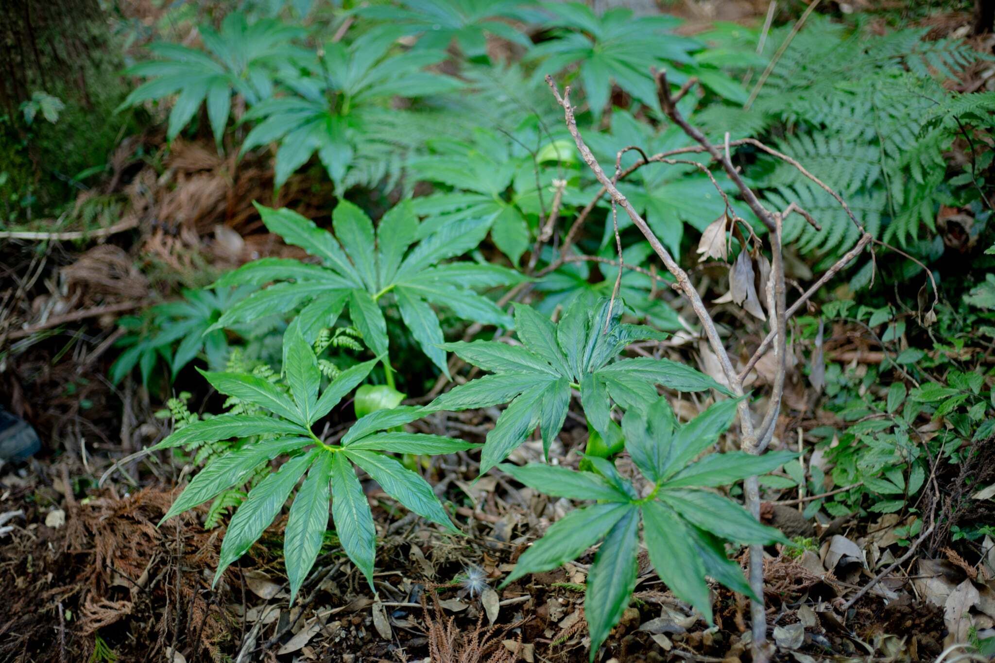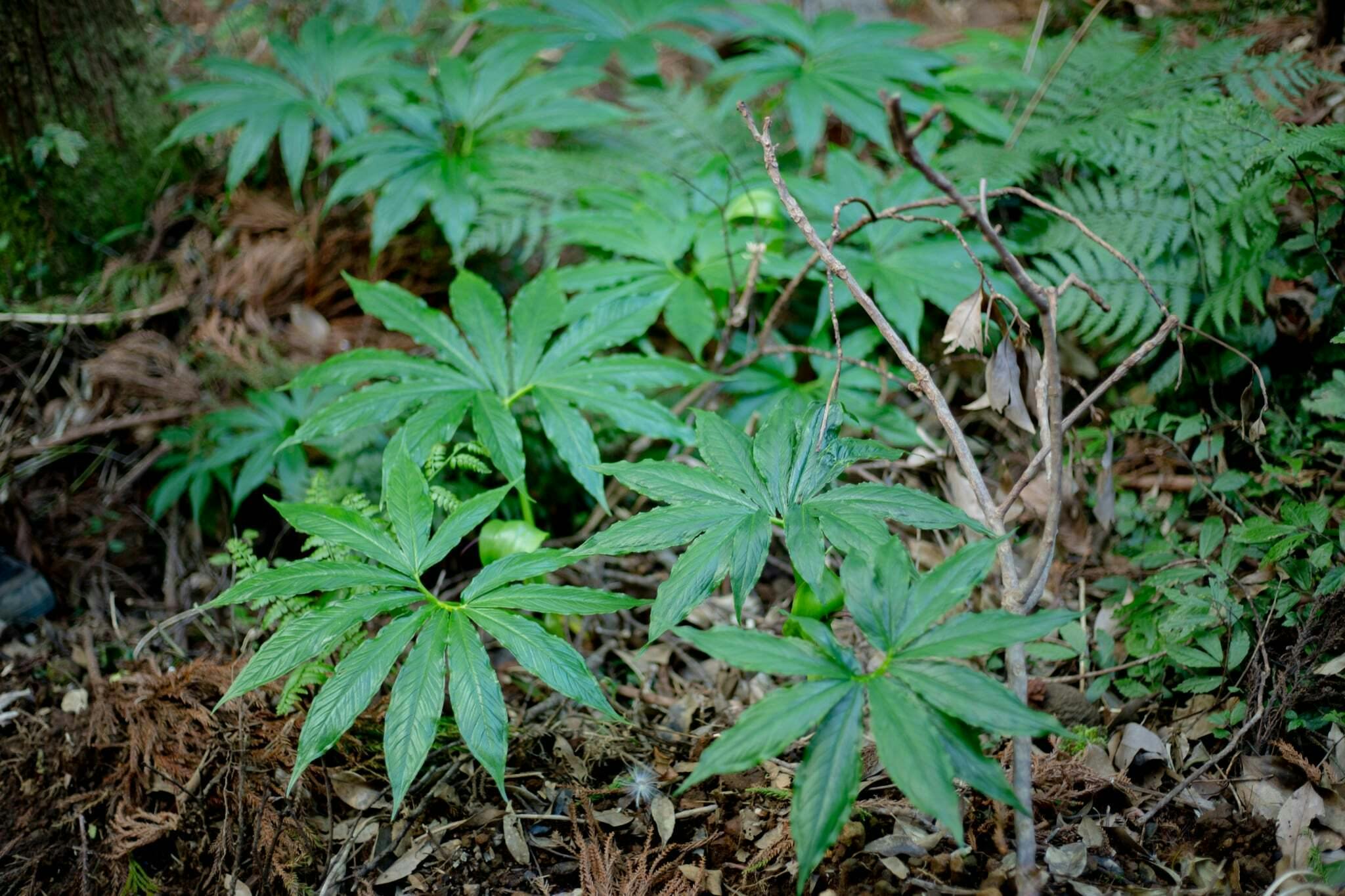 今年は、シマテンナンショウが豊作でした。八丈島では、かつて食料が乏しかった時代、球茎を茹でて餅のようにして食べていた植物で、島では「ヘンゴ」と呼ばれています。