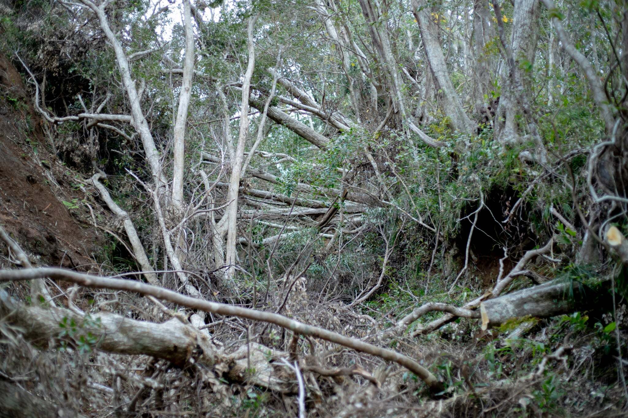 三原山は、今回の台風で最も大きな被害を受けたエリアです。水源につながる道があった場所には、無数の風倒木が折り重なり、人の往来は完全に途絶えています。
