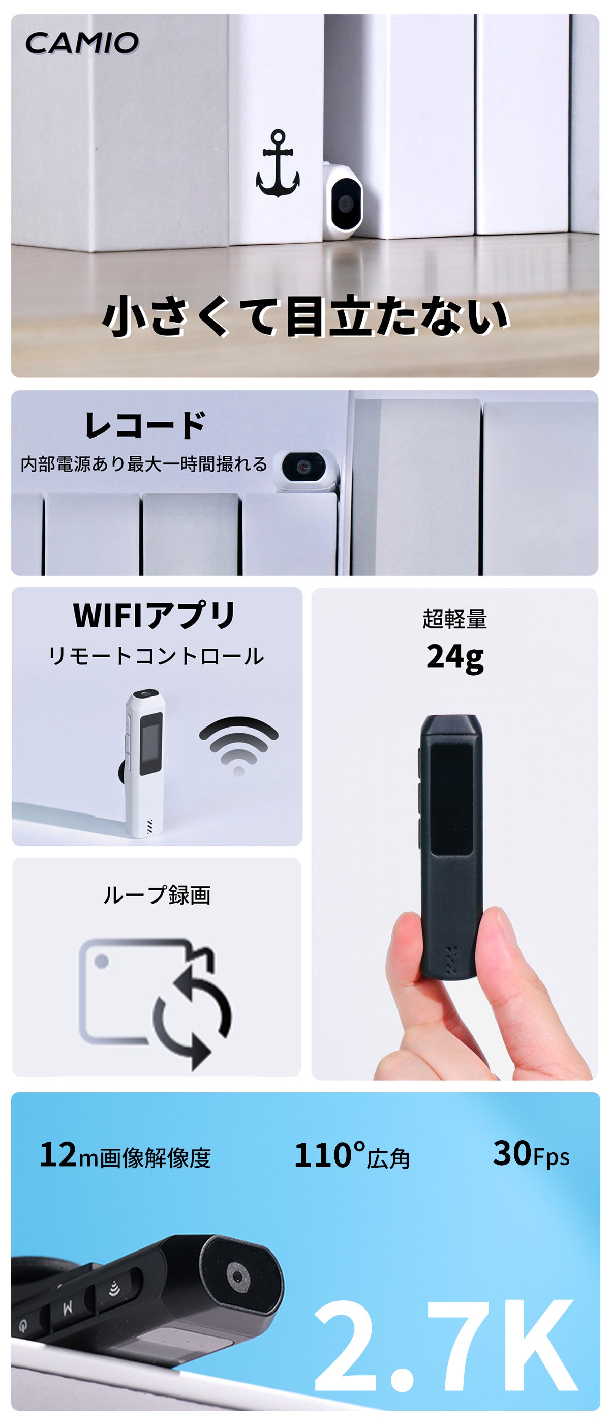 最大2.7Kの解像度で30fpsの動画を録画できます、110 °の超広角レンズにより、広い範囲を一望できる映像を作成できます。従来のウェアラブルカメラでは周辺の細節がボケがちだったり、暗所で画質が劣化したりしましたが、S112は自動露出調整とISO制御機能により、それらの課題を解決しました。