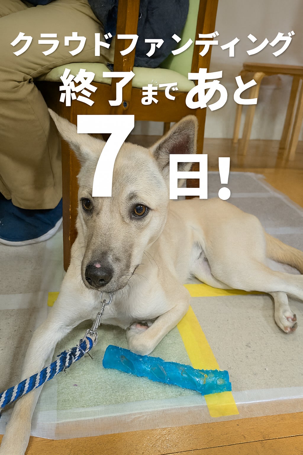 終了まであと8日になりました。今日は金曜日。夕方には訓練から施設に帰ってきます。職員との散歩では引っ張りが減りました。遊びの中でも甘噛みはしなくなりました。確実に成長しています!!引き続き訓練を続けるためには、皆さまの温かいご支援が必要です。訓練費や医療ケア、生活環境の整備に向けて、どうか応援をお願いいたします。「応援したい」「気になっていたけどまだだった」そんな方がいらっしゃいましたら、このタイミングでのご協力を心よりお待ちしています。最後まで見守っていただき、応援よろしくおねがいします!