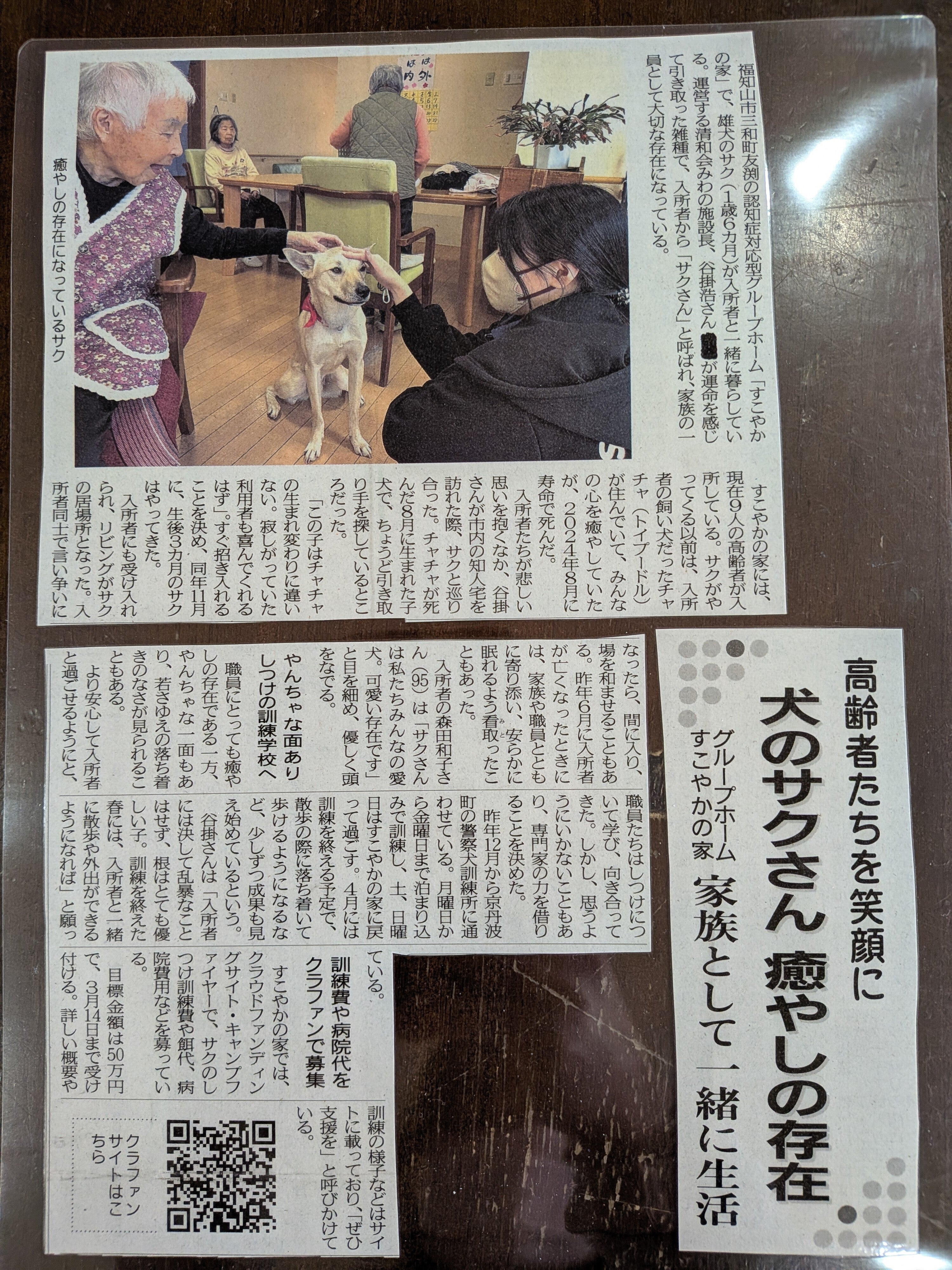 地域新聞の両丹日日新聞社様がサクの取材に来てくださいました。繰り返し見られるように、スクラップにしてみました♡記者さんの文章はさすがですね。改めて「サクがんばれ!」と思える記事にしてくださいました。両丹日日新聞社様、素敵な記事にしてくださりありがとうございました。新聞の紙面一面に掲載してくださいました!今回の記事は載っていませんが、両丹日々新聞ホームページはこちら