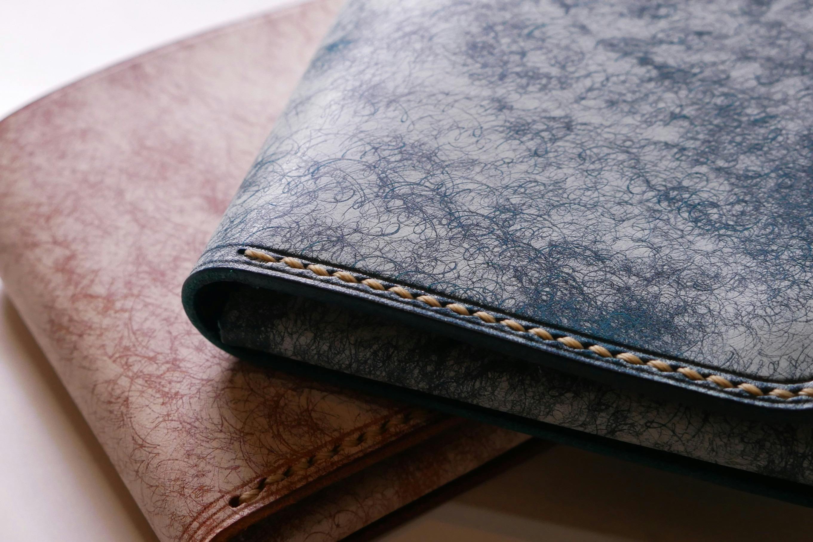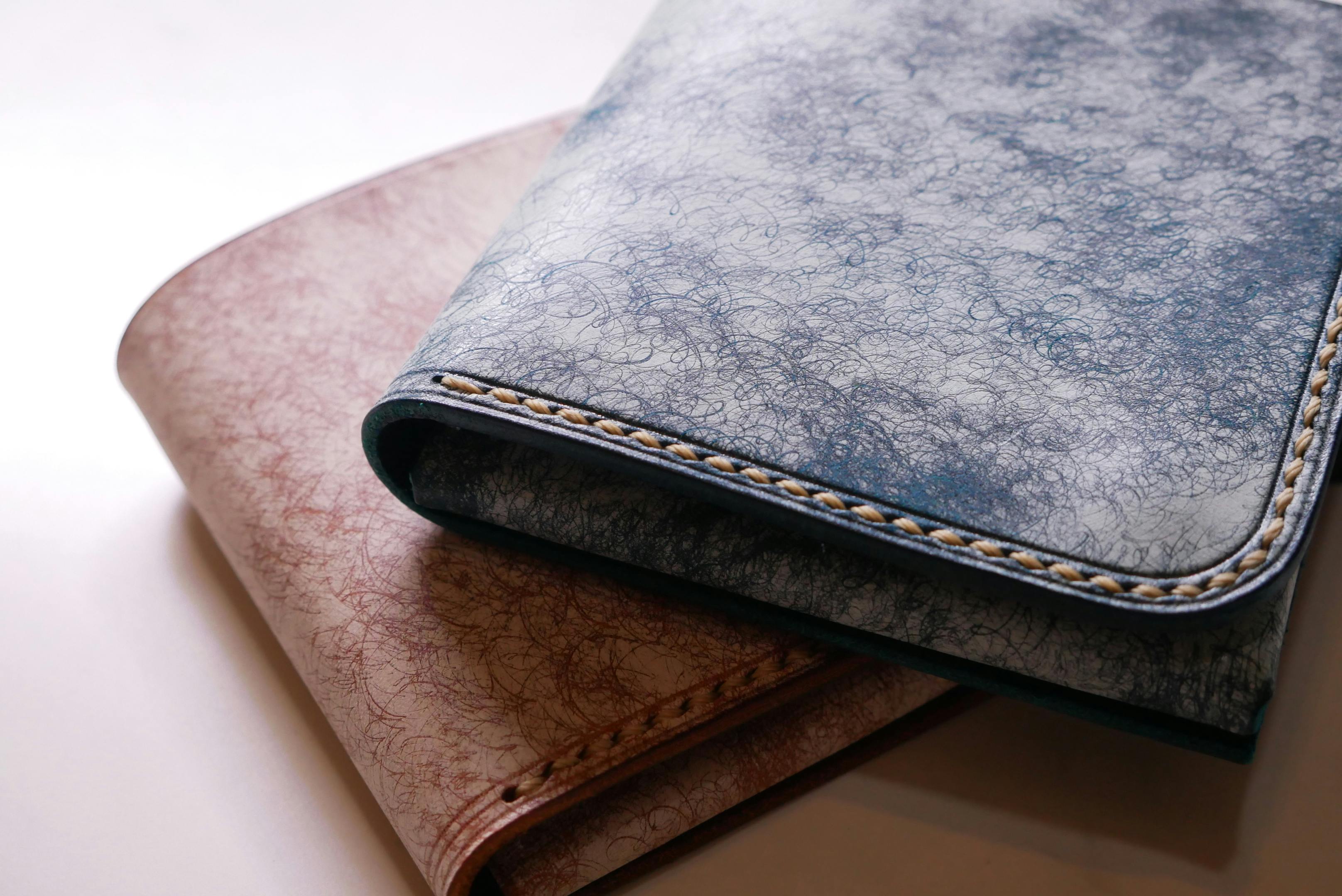 しっかりとオイルを含んだ牛革に、ワックスを乗せ、その上からスクラッチ加工を施した革です。