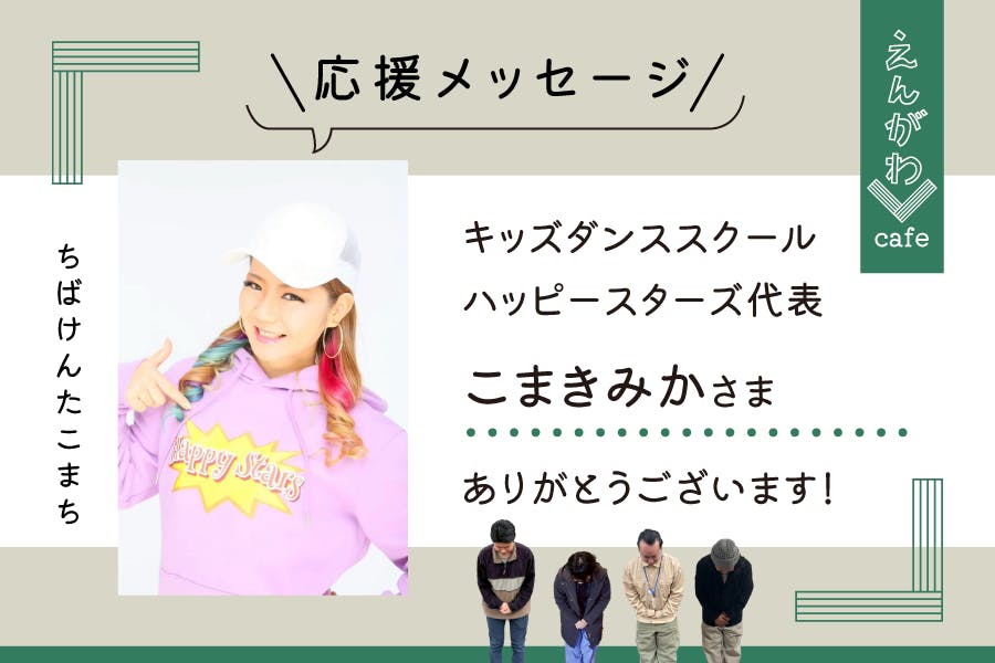 2026/03/05 15:48皆さま、いつも温かい応援ありがとうございます!この度、多古町のイベントでも出演いただいているキッズダンススクール「ハッピースターズ」代表の【こまきみか】さんからえんがわカフェプロジェクトに応援メッセージをいただきましたのでご紹介いたします!ーーーーーーーーーーーーーー2026年夏にオープンを目指した交流と挑戦が生まれるカフェ‼「えんがわカフェ」プロジェクトを心から応援しています!多古町に地域の人々が自由に集い、交流し、チャレンジできる場をつくるという想いに深く共感しました。こうした場所は、人と人とのつながりを育み、新しいアイデアやチャレンジを生み出す原動力になると思います。多古町に移住して地域おこし協力隊として活動されている皆さんが準備しているということで、私自身も多古町に移住してきて、自然豊かで住みやすく、私も大好きな多古町に『えんがわカフェ』がオープンするのが楽しみです!このプロジェクトの未来がより多くの人に届き、実現へとつながるよう応援しています!がんばってください!ーーーーーーーーーーーーーーこまきみかさんありがとうございます!ハッピースターズの子どもたちはいつも元気いっぱいに多古町の大きなイベントを彩ってくれています!子どもたちにとっても憩いの場になれるように頑張っていきます!皆さまも引き続きご支援いただけたら嬉しいです!今後も進捗を発信していきますのでInstagram共々よろしくおねがいします!えんがわカフェ加藤唯斗、小倉真紀、笠川和憲、北條将徳 もっと見る