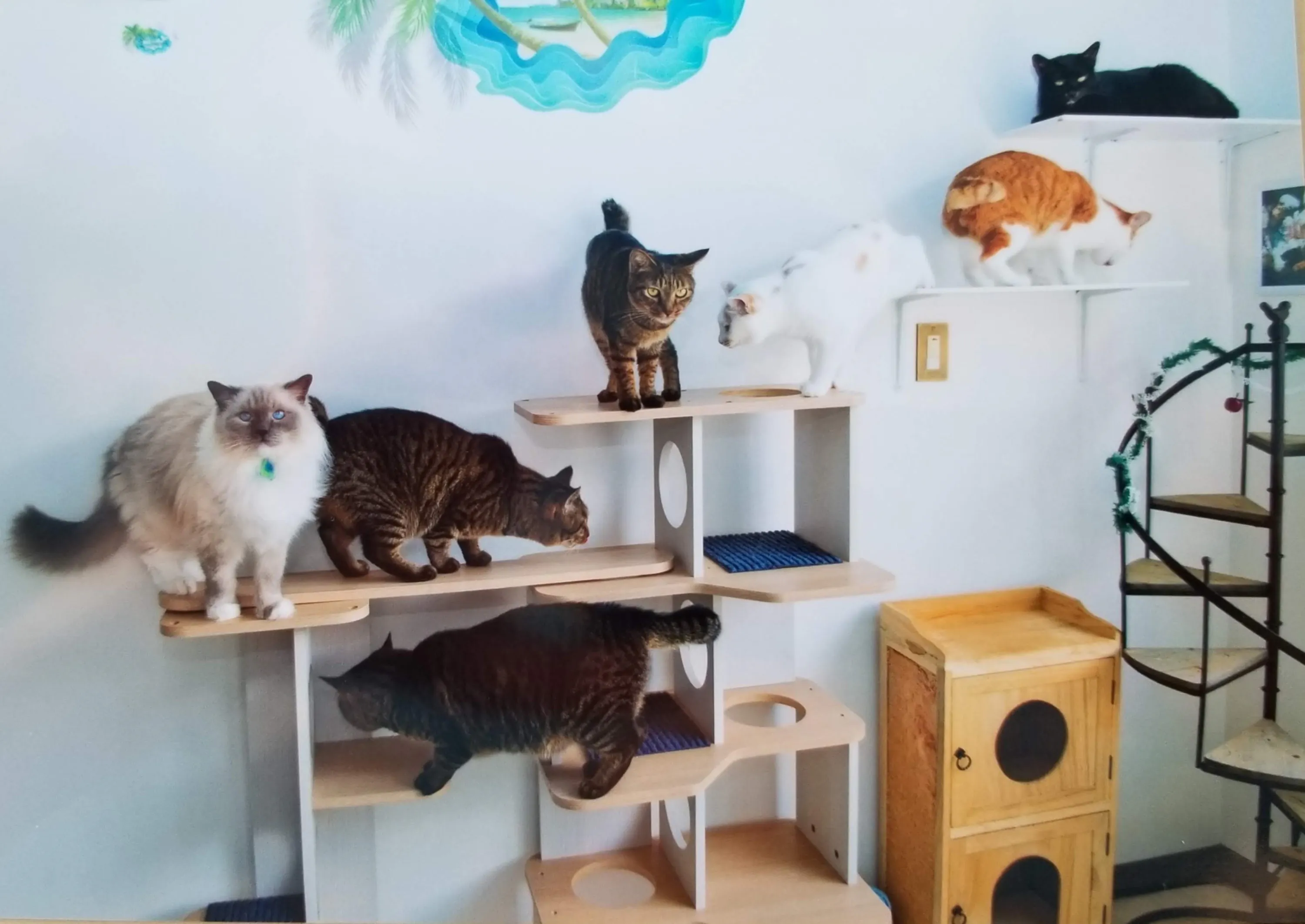 この子達の居場所を守り存続する為、転勤先の一軒家から実家の小樽市へ戻り、2階をリフォームして猫カフェを家族や友人、一丸となって作りました。(オープン当時は15名程、猫カフェに居ました)