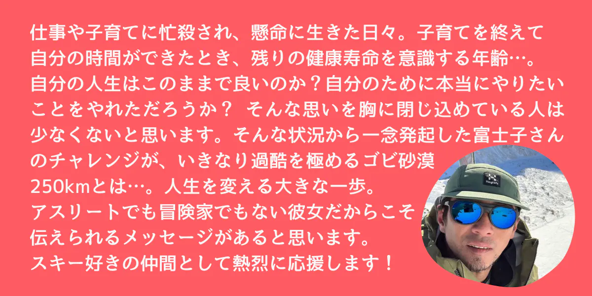 2026/02/28 10:00こんにちは。板澤 富士子です。本日、クラウドファンディング最終日です。ここまで本当にたくさんの応援をいただきました。ひとつひとつの支援が、私の背中を押し続けてくれました。モンゴル250kmという大きな挑戦は、決して私ひとりの挑戦ではありません。1人でも多くの方と、この挑戦を一緒に走りたい。ゴールを切るその瞬間、「一緒に走った」と胸を張って言える仲間が、ひとりでも多くいてくれたら嬉しいです。そしてその応援は、私が諦めそうになった時、ものすごく大きな力になります。最後まで、どうか見届けてください。そしてもし心が動いたら、応援という一歩をお願いします。あなたの一歩が、私の一歩になります。■□□□■□□■□□□□■□【ゴビ砂漠250kmマラソン】45歳のシンママが限界の先で人生を取り戻す挑戦!このプロジェクト期間は、本日、2026年2月28日(土) 23:59まで。下記の【シェアしてプロジェクトをもっと応援!】では、Xでの投稿、Facebookでのシェア、LINEへの送信が簡単にできます。上記のURLをコピーしてお送りいただいても、大変ありがたいです。シェア拡散が、「ゴビ砂漠レース」のゴールへと導きます。どうぞよろしくお願いします。板澤 富士子Instagram ▶︎ mt.fuji もっと見る【クラファン100%達成のご報告】