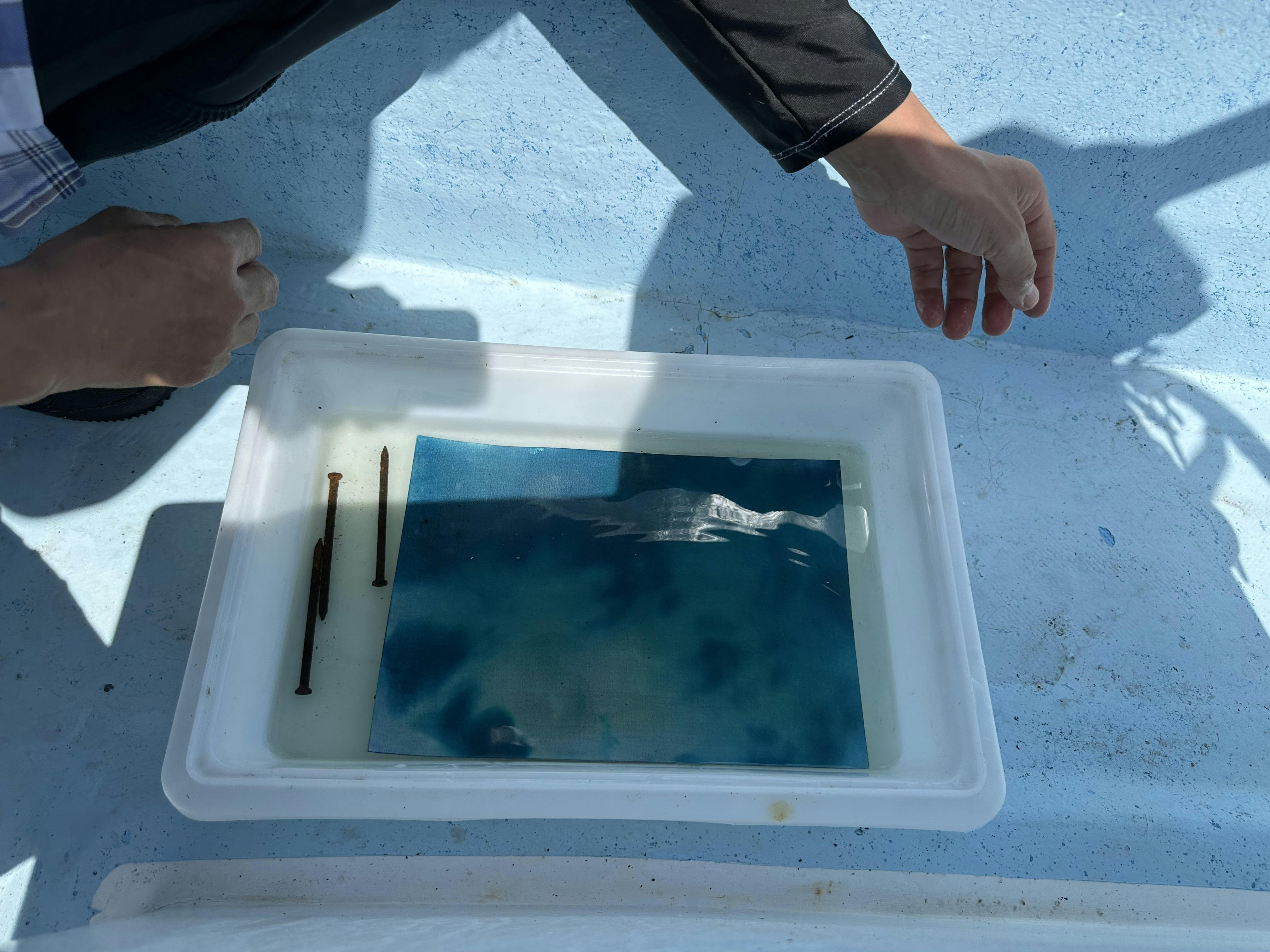 (以下の写真はダングリガ沖合にて研究リサーチ中に日光写真作成の様子)