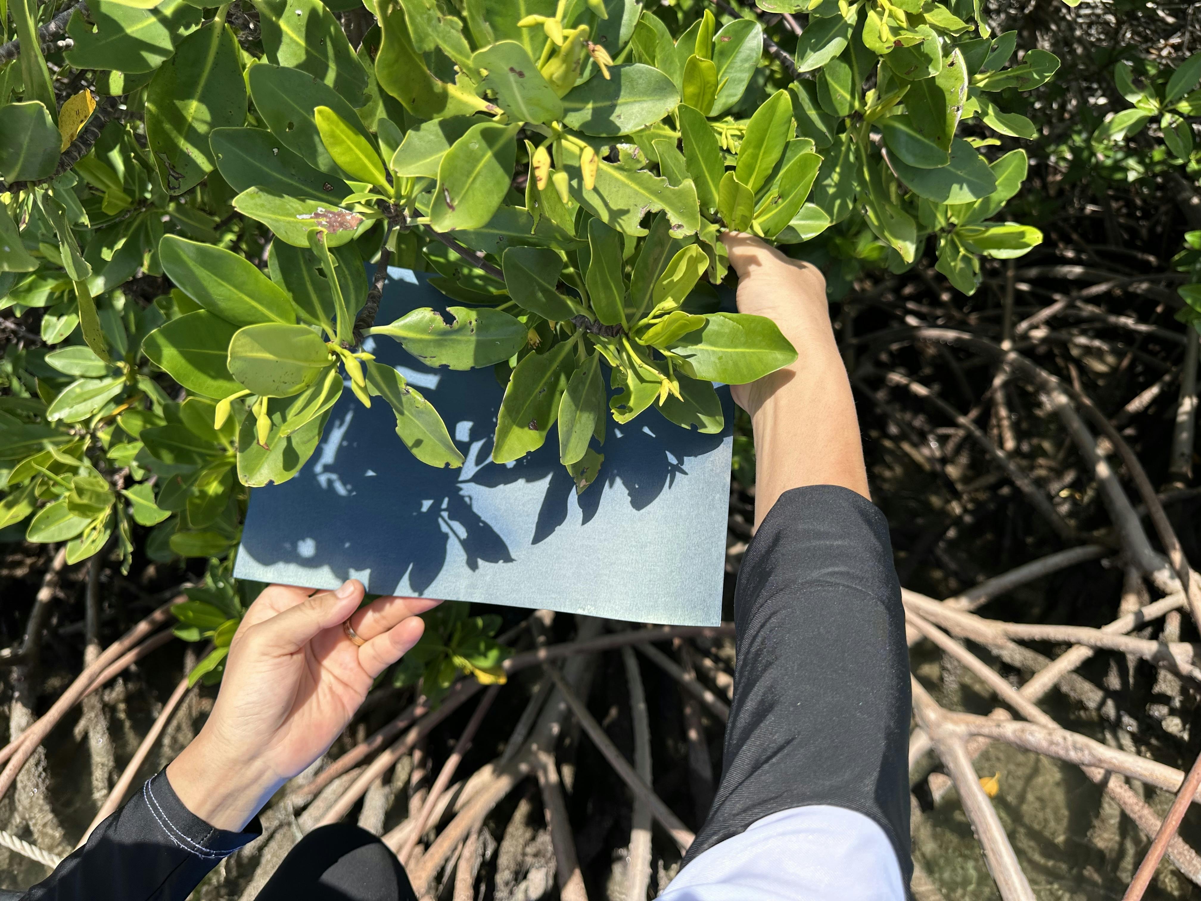成長したマングローブの枝や葉、そして種というか苗というか(プロパギュールと呼ばれる)細長い「次世代のマングローブ」が影絵のように白く浮かび上がります。白く影を映し出すシンプルで幻想的な感光紙を使っています。