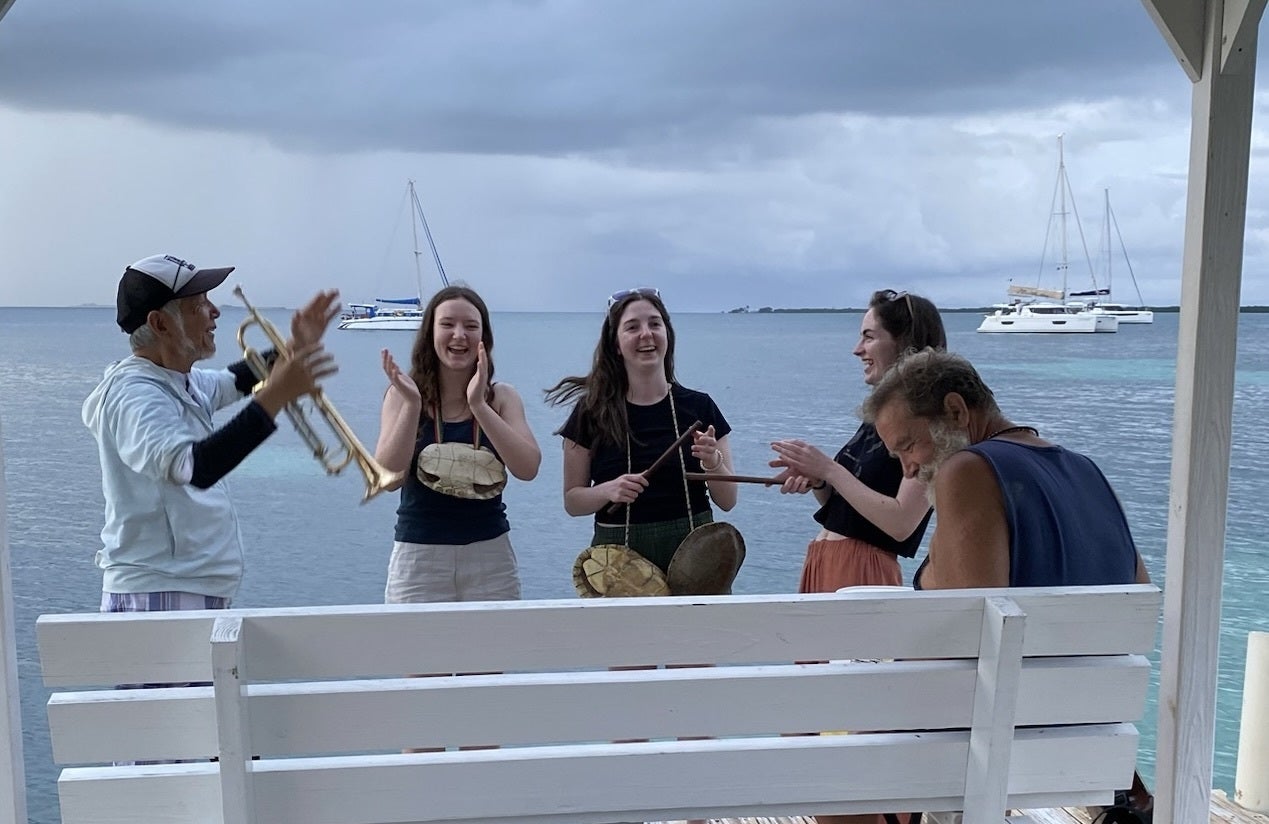 絶景の夕日を浴びながら亀の甲羅のタイコとギターとトランペットでジャムっていたら、女子大生が飛び入りで見事なコーラスを展開してくれました。