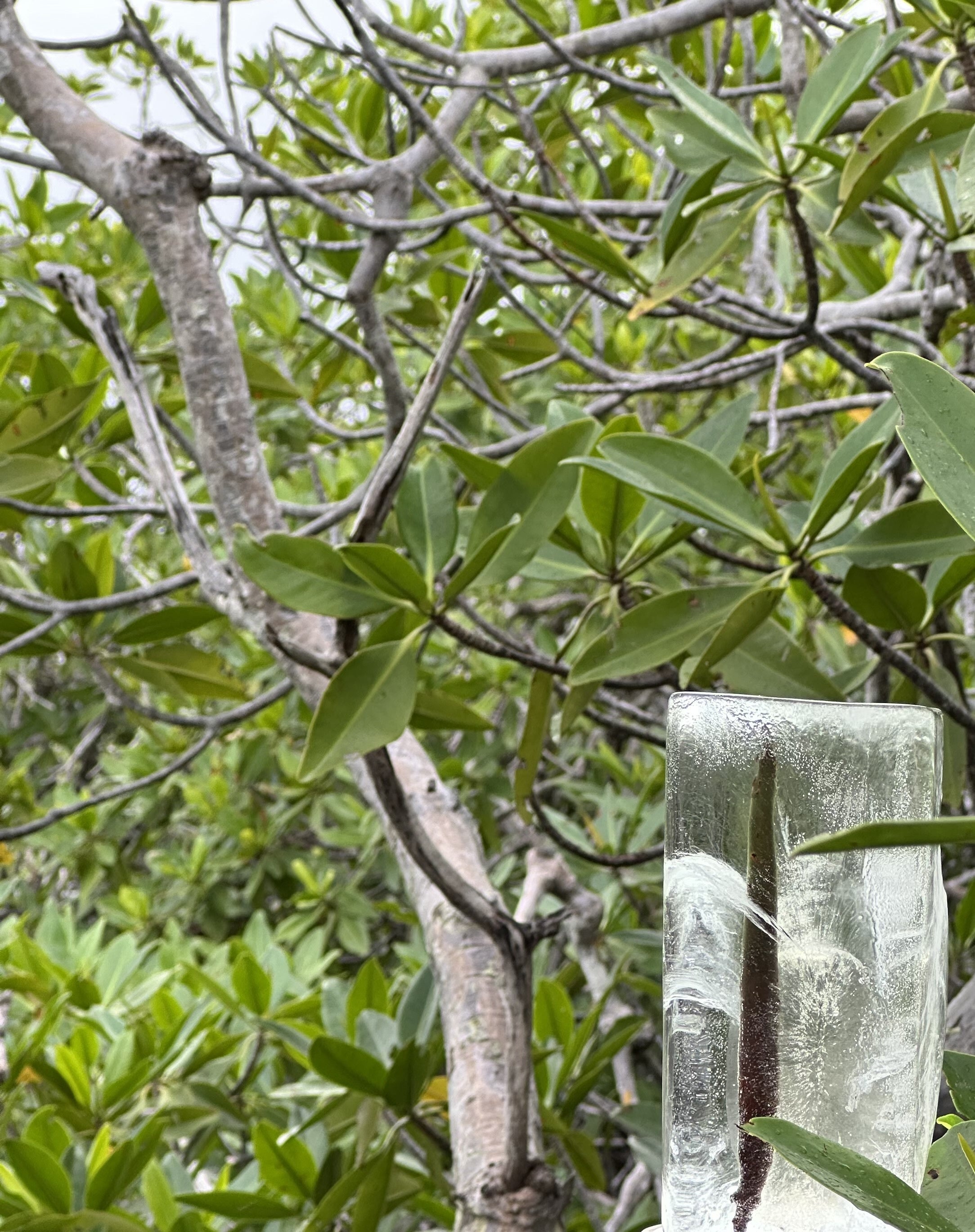 成長したマングローブの枝や葉、そして種というか苗というか(プロパギュールと呼ばれる)細長い「次世代のマングローブ」が影絵のように白く浮かび上がります。白く影を映し出すシンプルで幻想的な感光紙を使っています。