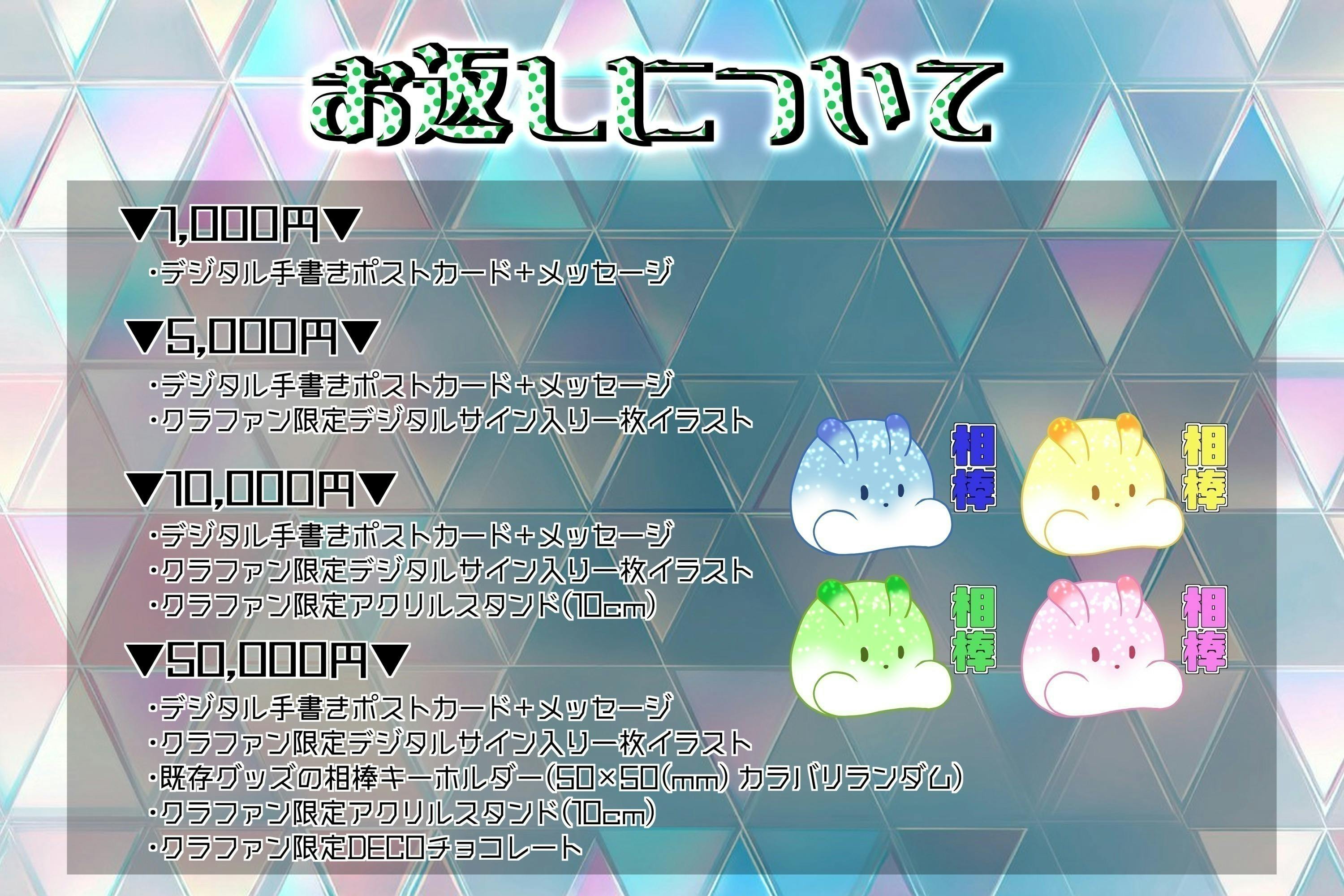 ・デジタル手書きポストカード+メッセージ ・クラファン限定デジタルサイン入り一枚イラスト ・既存グッズの相棒キーホルダー(50×50(mm) カラバリランダム) ・クラファン限定アクリルスタンド(10cm) ・クラファン限定DECOチョコレート ・クラファン限定「相棒証明書」データ ・配信エンドロール&クラファンページにお名前の掲載 ▼DECOチョコレートについて▼ 名称:DECOチョコ 内容量:15個 アレルギー品目:乳成分・大豆 ※ 本品製造工場では、小麦・卵・ピーナッツ・くるみを含む製品を生産しています。 賞味期限は発送から3ヶ月以上のものをお届けできるよう努めております。 直射日光を避け、28度以下の涼しい場所で保管してください。 原材料及び添加物等の食品表示はお届け商品のラベルに表記されます。商品開封前には必ずお届けのリターンに貼付されたラベルや注意書きをご確認ください。 ▼配信エンドロール・クラファンページへのお名前記載について▼ 掲載方法:クラウドファウンディング終了後 本プロジェクト終了のお知らせ配信をします。 その際の配信エンドロールにお名前を流させていただきます。 注意事項:支援時、必ず備考欄に掲載を希望されるお名前をご記入ください 「相棒証明書」の画像の受け渡しについては プロジェクト終了後にお送りするメールをご確認ください。 クラファンページへのお名前記載につきましては、本クラウドファウンディング終了後 備考欄に記載いただいたお名前を記載させていただきます。 風太郎直筆のデジタル手書きメッセージとデジタルサイン入りイラスト それからクラファン用にデザインしたアクリルスタンド 既存グッズからスライム相棒アクリルキーホルダーをカラーはランダムで! そのほかクラファン限定DECOチョコレートを提供! さらにさらに! クラファンでしか入手できない「相棒証明書」のデータ送付! それだけじゃないぜ! 結果発表の配信のエンドロールと、クラファンのページに 支援者の名前を掲載させてもらうぜ! 沢山支援してくれてサンキューな!