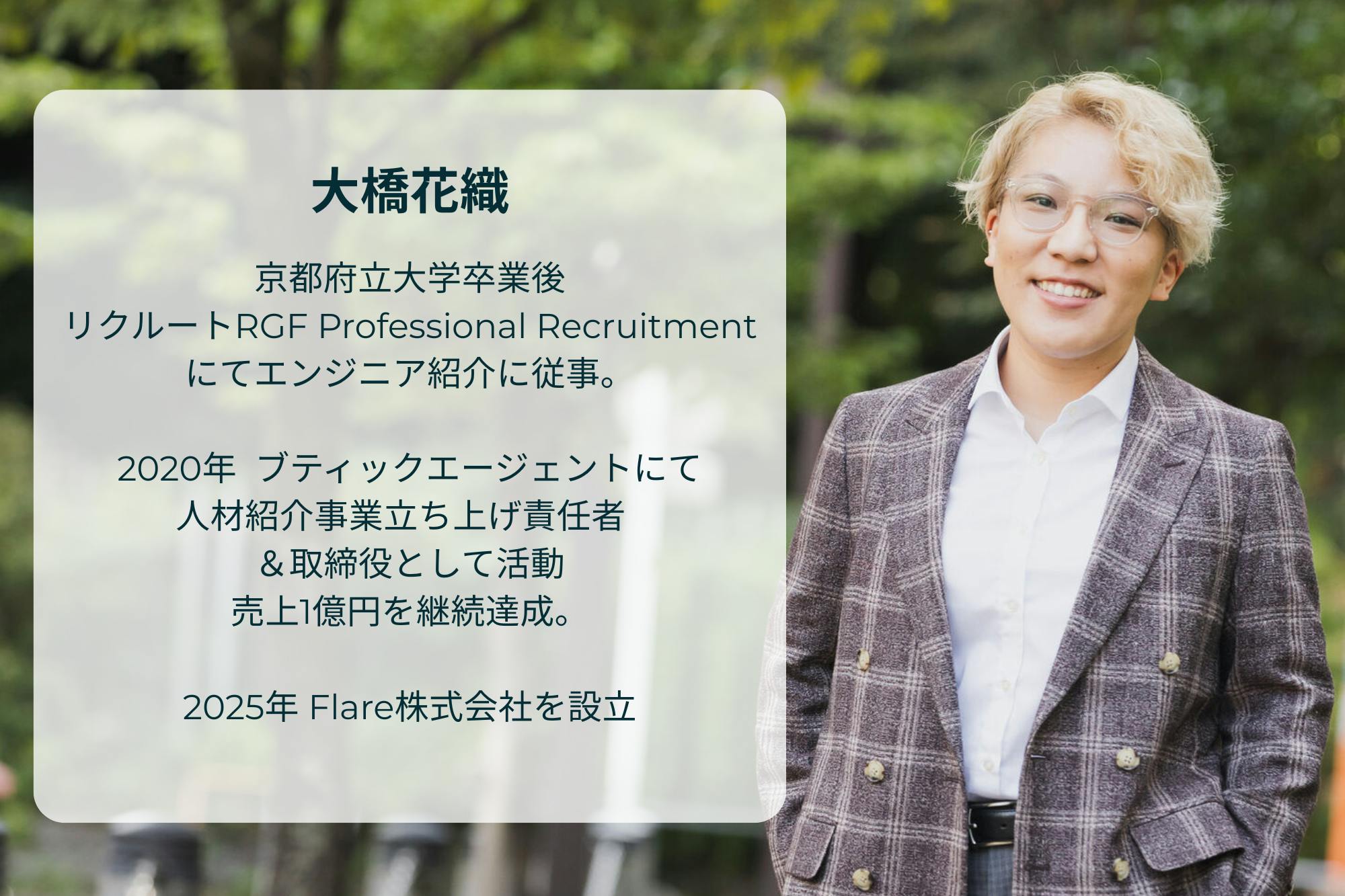 ハイクラス転職支援エージェントFlare株式会社代表取締役の大橋花織と申します。
