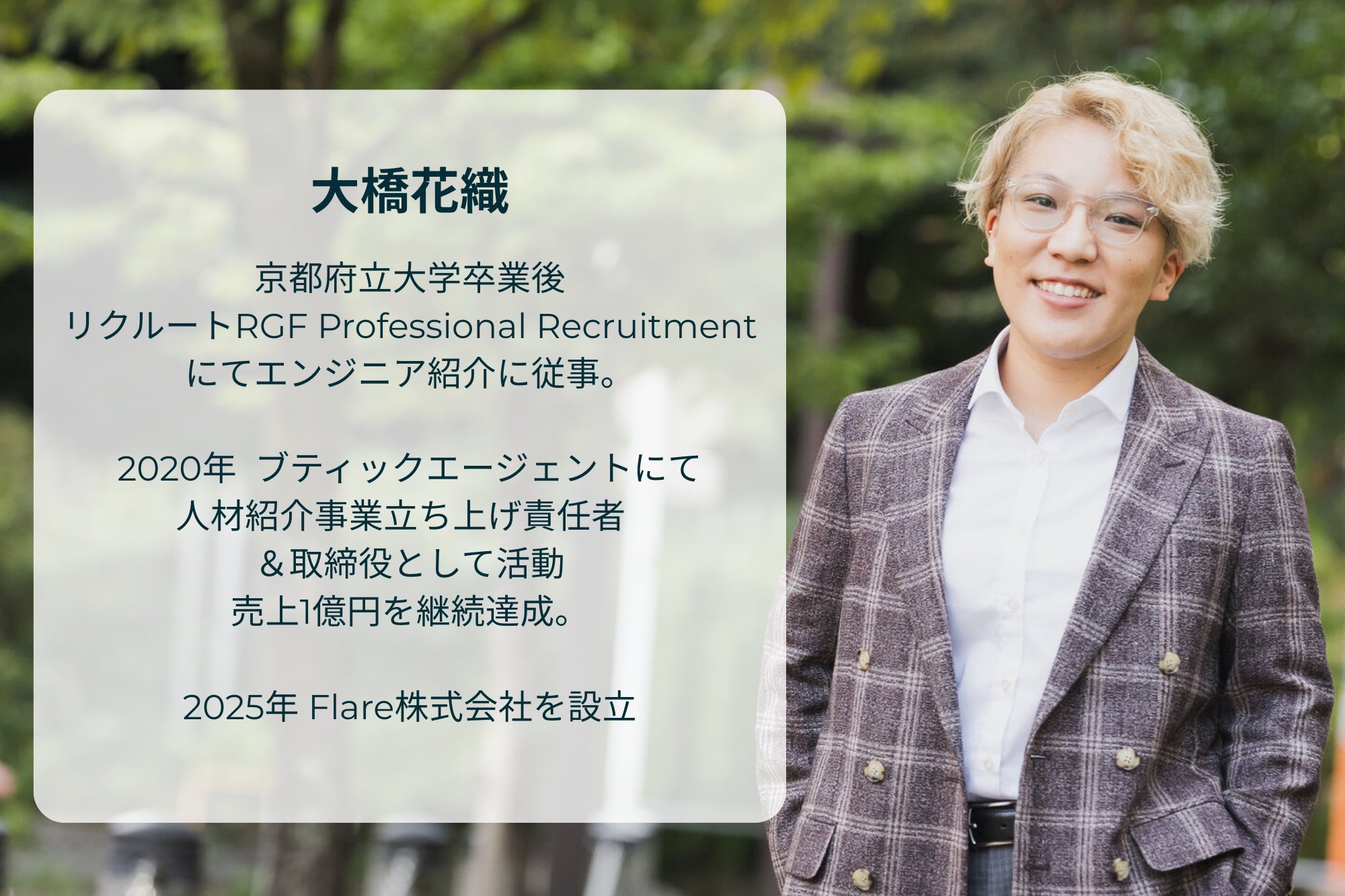 ハイクラス転職支援エージェントFlare株式会社代表取締役の大橋花織と申します。