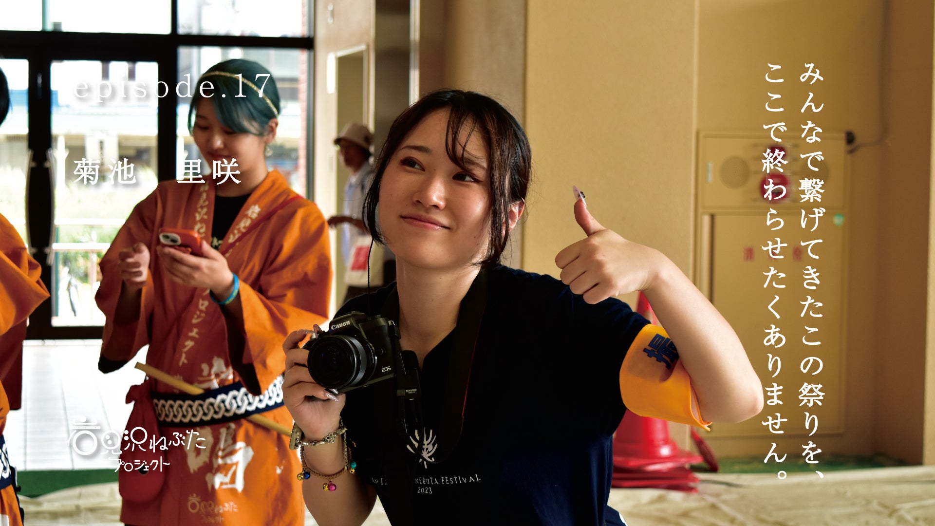 この祭りに運営として関われるのは今年が最後になります。岩⾒沢ねぶたプロジェクト実⾏委員会広報部の菊池です。現在は北海道教育⼤学3年⽣で、今年4年⽣になります。つまり、運営メンバーとして中⼼となって関われるのは、今年の岩⾒沢ねぶた祭が最後です。2024年の岩⾒沢ねぶた祭では、先輩にカメラを貸してもらい、祭りに関わるみんなの写真を撮っていました。仕事中の真剣な表情、運⾏を終えたあとの達成感に満ちた笑顔。その⼀瞬⼀瞬を切り取る時間が本当に楽しくて、⼀昨年の 20 歳の誕⽣⽇に、⺟から⼀眼カメラをプレゼントしてもらいました。2025年の祭りでは、そのカメラを使って、運⾏中だけでなく、準備の様⼦や会場の空気、活動中のみんなの姿を撮影してきました。私たち広報部にとって⼀番⼤変なのは、実はお祭り当⽇よりも“準備期間”です。SNS の投稿作成、チラシやドキュメントブックの編集、制作したねぶたをより多くの⼈に知ってもらうための PR キャラバン。祭り本番に向けて、やることは本当にたくさんあります。⼤学⽣活やバイトと両⽴しながらの活動は、決して楽ではありません。それでも、「この祭りを知ってもらいたい」「⾜を運んでもらいたい」という想いで、広報部全員が準備期間を⾛り続けています。特に PR キャラバンでは、本当に多くの⼈と関わります。応援してくれる⼈、岩⾒沢ねぶた祭について興味を持ち、たくさん質問してくれる⼈。「今年⾏きます」「来年は⾏きます」と声をかけてくれる⼈。ほとんどの⼈がこの祭りを応援してくれています。正直に⾔うと、岩⾒沢ねぶた祭の知名度は、全然⾼くありません。こんなにも⾃信を持って「楽しい」と⾔えるお祭りなのに。多くの⼈に⽀えられてきた⼀⽅で、運営や資⾦の⾯では、継続が簡単ではない状況が続いています。それでも、みんなで繋げてきたこの祭りを、ここで終わらせたくありません。岩⾒沢ねぶた祭を、岩⾒沢の⼤切な⽂化として、100年先も残していくこと。そして、北海道を代表するイベントの⼀つにしていくこと!(今は⼤きい夢だけど!)その想いで、現在クラウドファンディングに挑戦しています。終わらせないために、実⾏委員⼀同、これからも全⼒で取り組んでいきます。まずは SNS を⾒るだけでも構いません。そして、少しでも興味を持ってもらえたら、できれば現地に⾜を運んでもらえたら嬉しいです。菊池 里咲