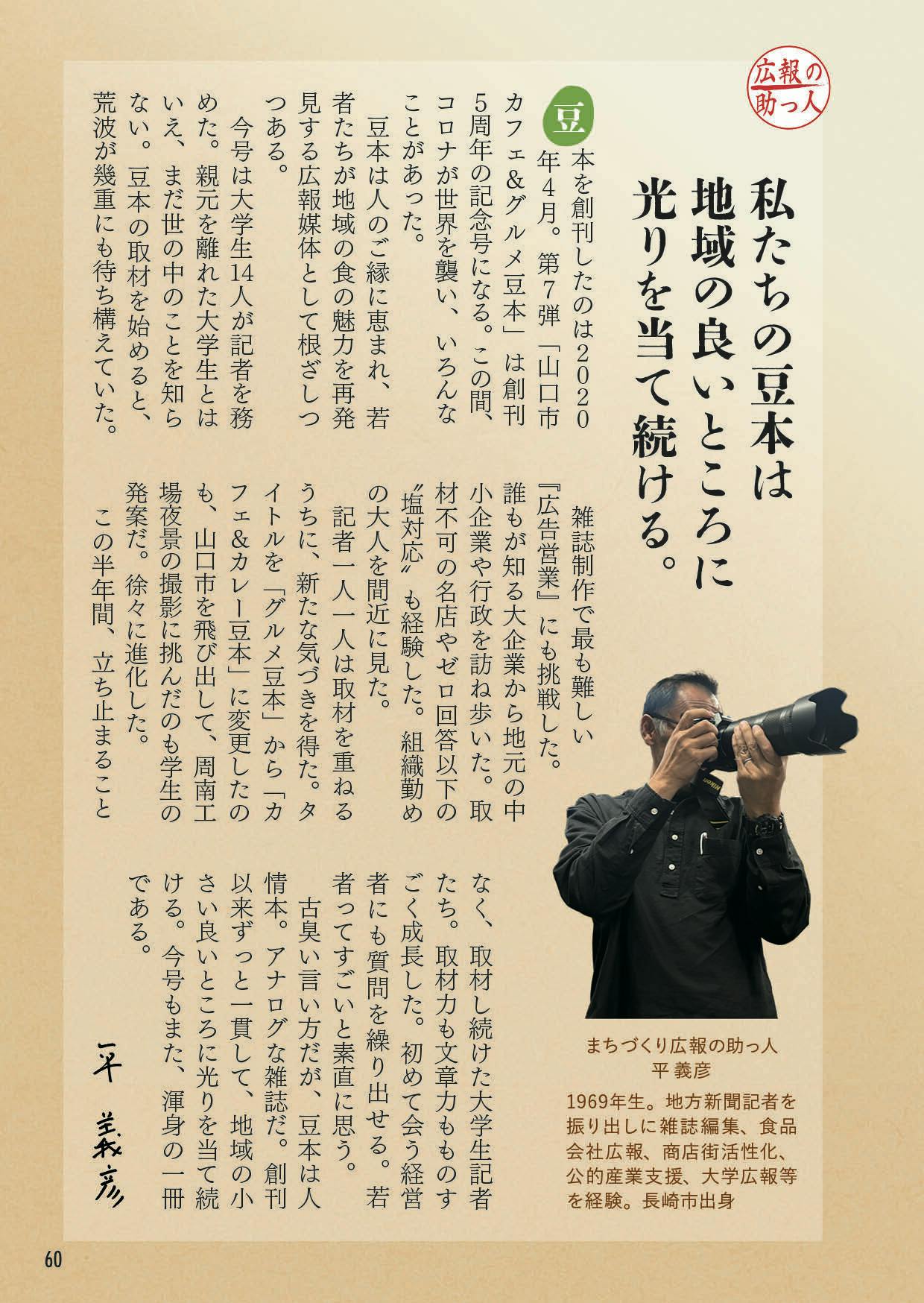 私は平義彦️と申します。屋号は「広報の助っ人」。2020年4月に「徳山駅旅グルメ豆本」を発刊して以来、計7冊の豆本を発刊しました。取材記者は高校生や大学生、社会人ら素人の皆様が務め、私が発行人や編集長を担います。現在、山口大学の学生有志10人と一緒に「旅豆本」を制作しています(2026年2月発刊予定)。